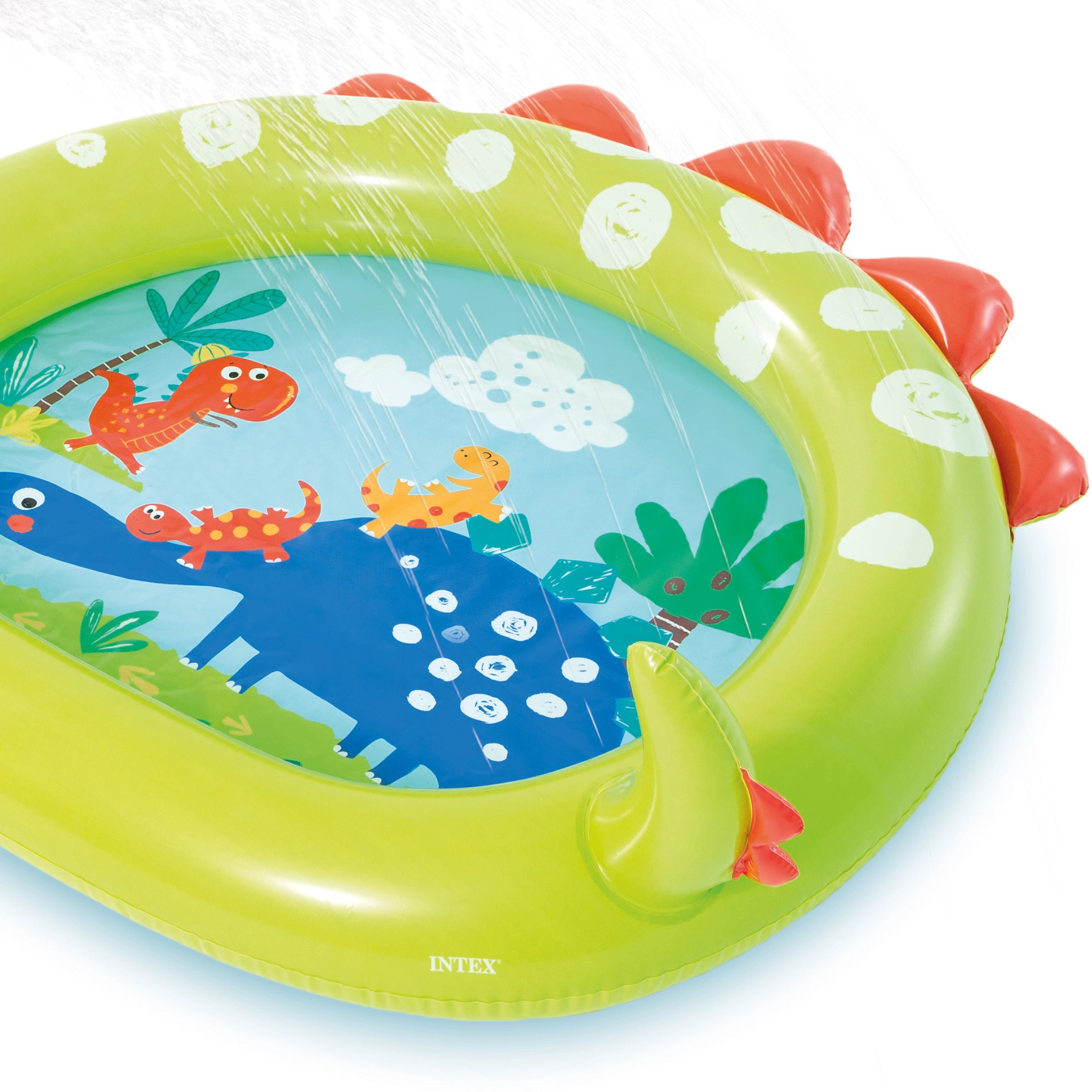Alegre piscina inflable con fuente y diseño de dinosaurio, ideal para la diversión veraniega en el jardín. La piscina está hecha de material PVC de alta calidad y mide 119 x 109 x 66 cm.
