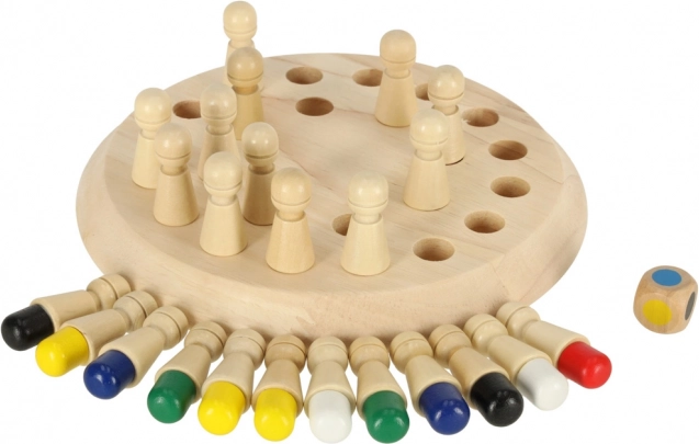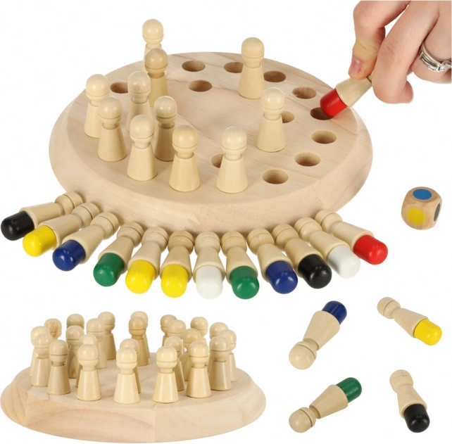 Este juego de memoria de madera combina reglas simples con un entrenamiento inteligente del cerebro. Primero, los jugadores memorizan los colores de las clavijas, luego las giran y, según el resultado del dado, buscan el color correcto. Gana puntos quien mejor recuerde. El juego desarrolla la coordinación mano–ojo, la motricidad fina y la concentración.