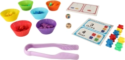 Este colorido set combina aprendizaje y juego. Los niños pueden contar, comparar y asignar colores, resolver ejercicios sencillos y entrenar la concentración. Los vasitos de silicona ayudan a clasificar, los cubos de madera y las tarjetas de trabajo ofrecen decenas de actividades para jugar de forma individual o en grupo.