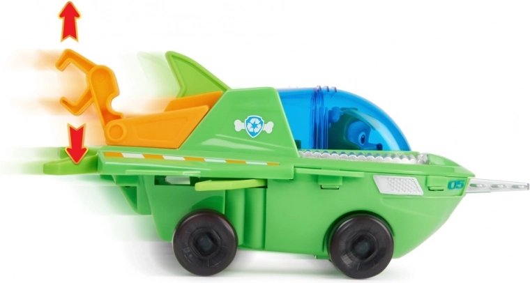 Rocky, el experto en reciclaje del equipo PAW PATROL, llega en la edición Aqua Pups con su vehículo submarino inspirado en un pez sierra. Gracias a la cabina azul transparente, puedes sentar la figura dentro y partir hacia nuevas misiones acuáticas. Las resistentes ruedas permiten desplazarse por tierra y el gancho móvil añade más posibilidades de juego.