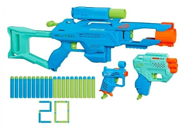 - 3 blásters (Operator DB-2, Trio TD-3, Ace SD-1), 20 dardos NERF Elite