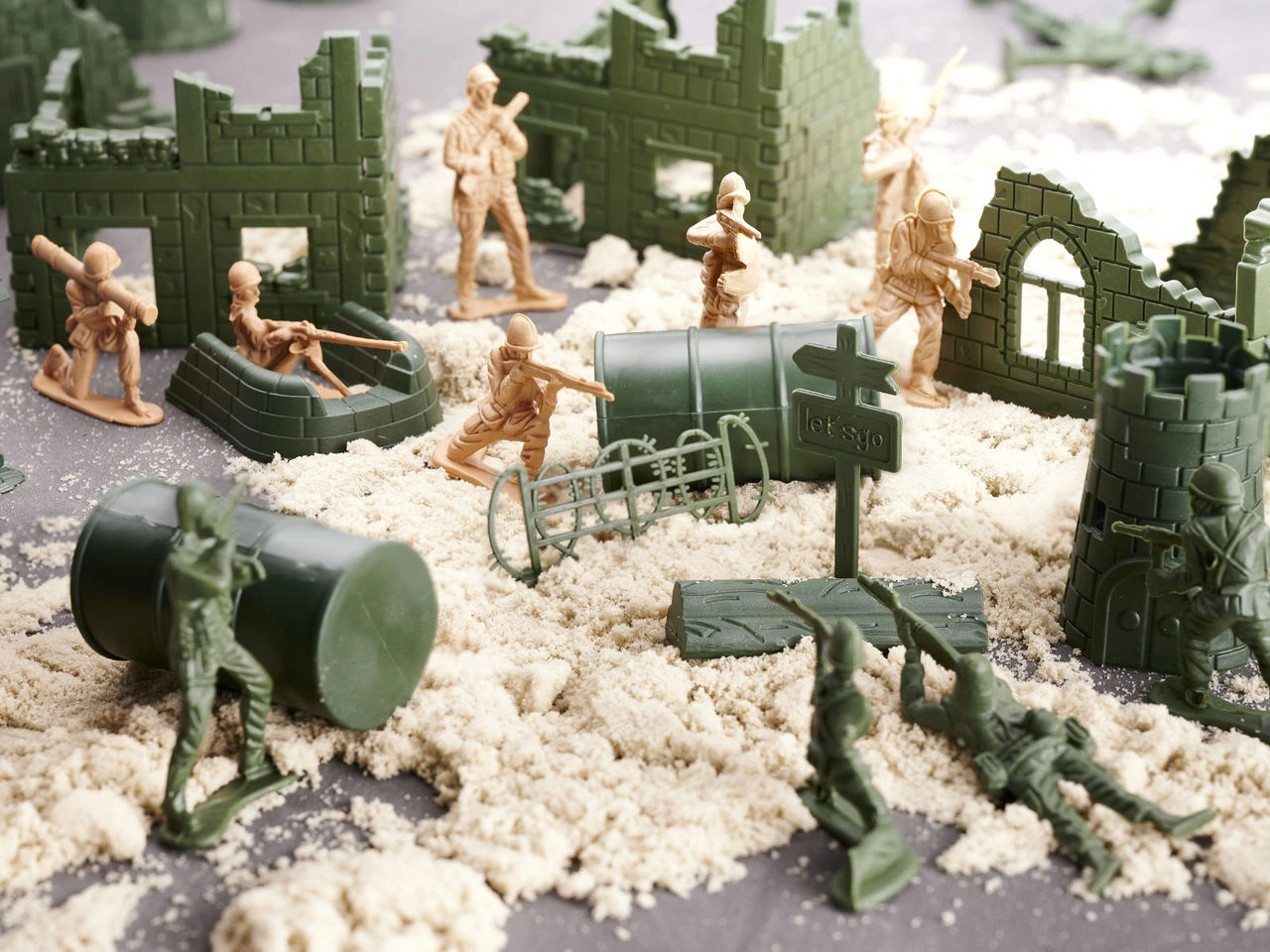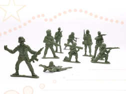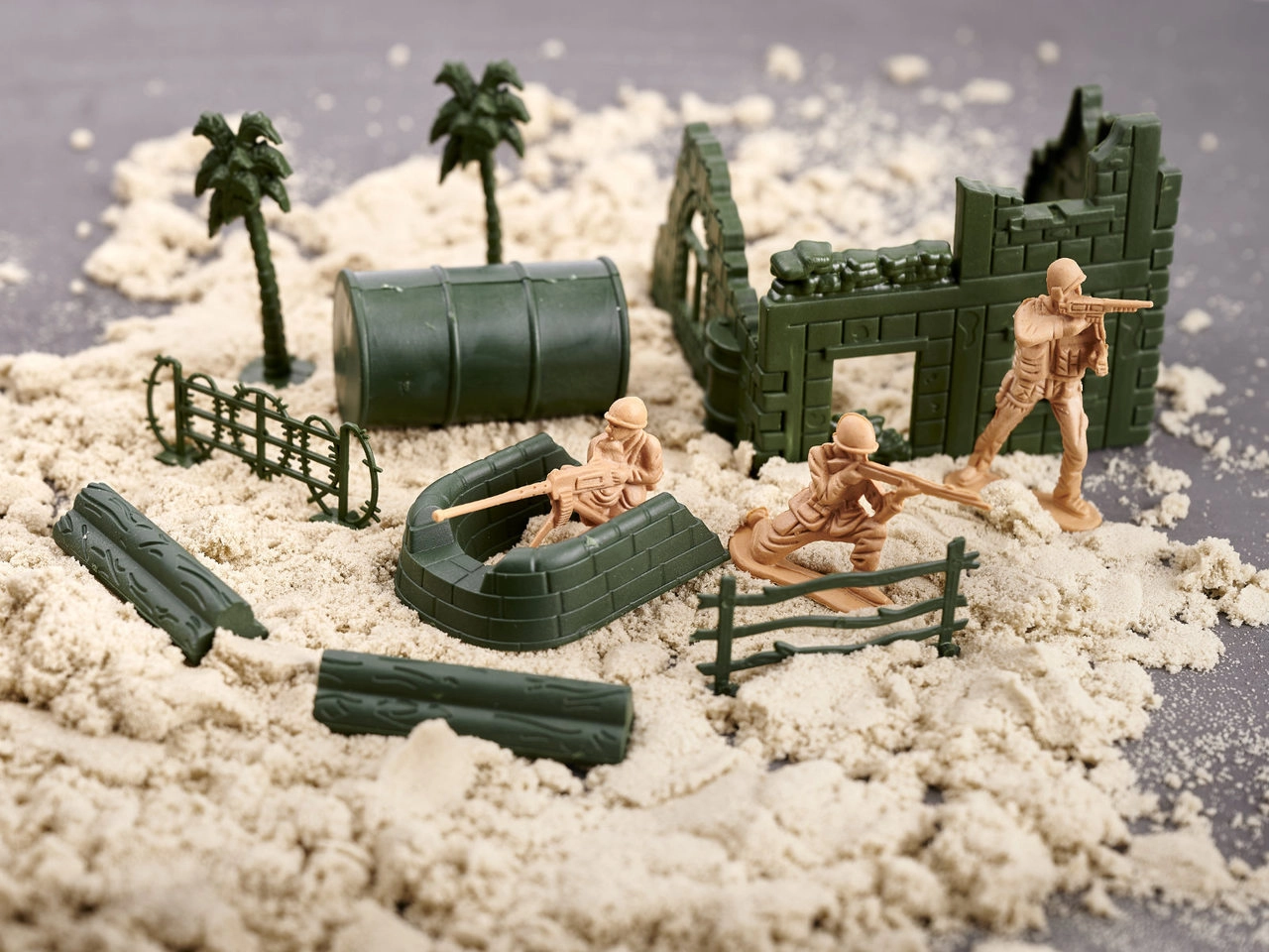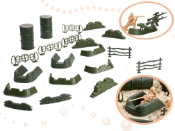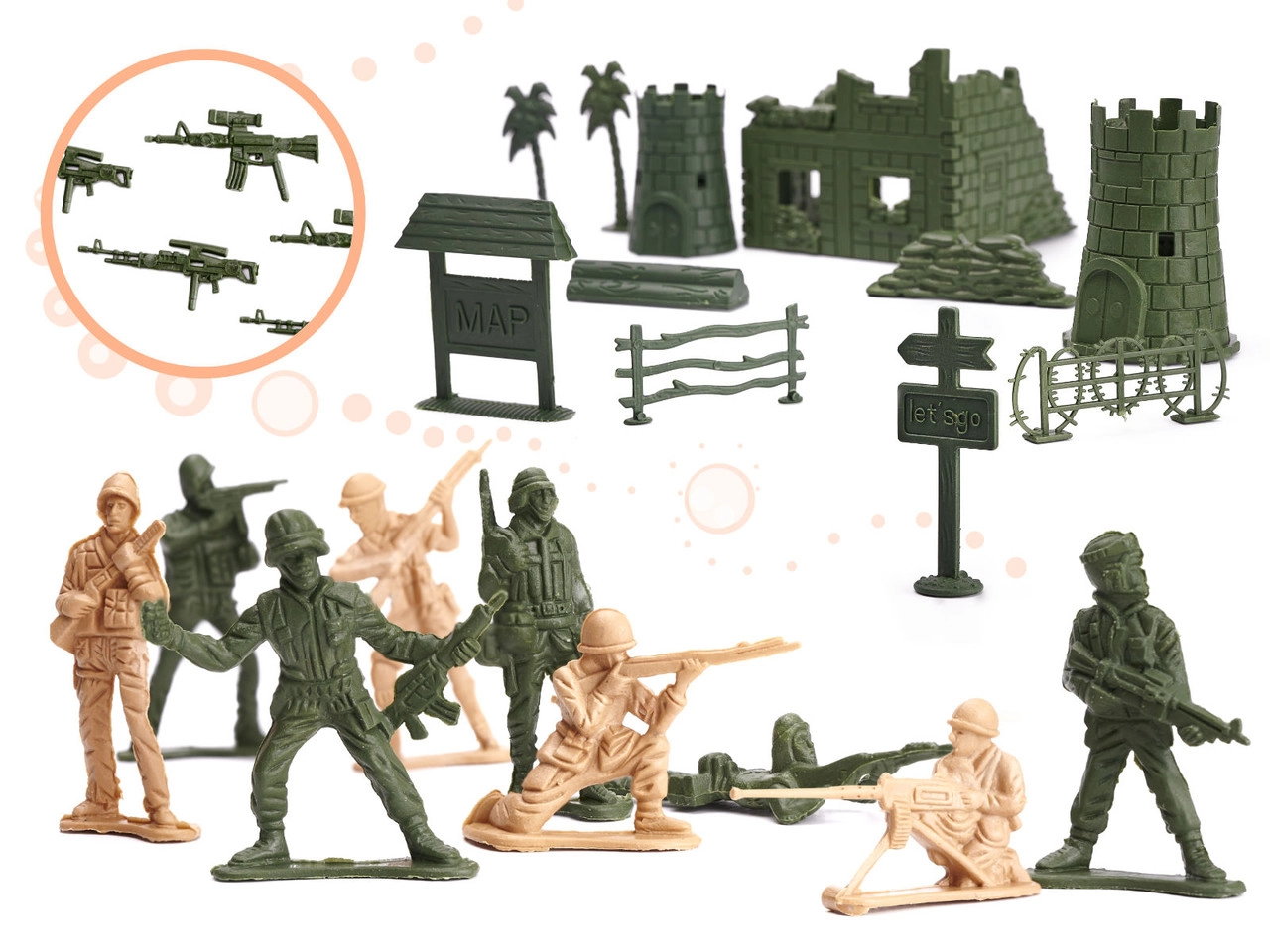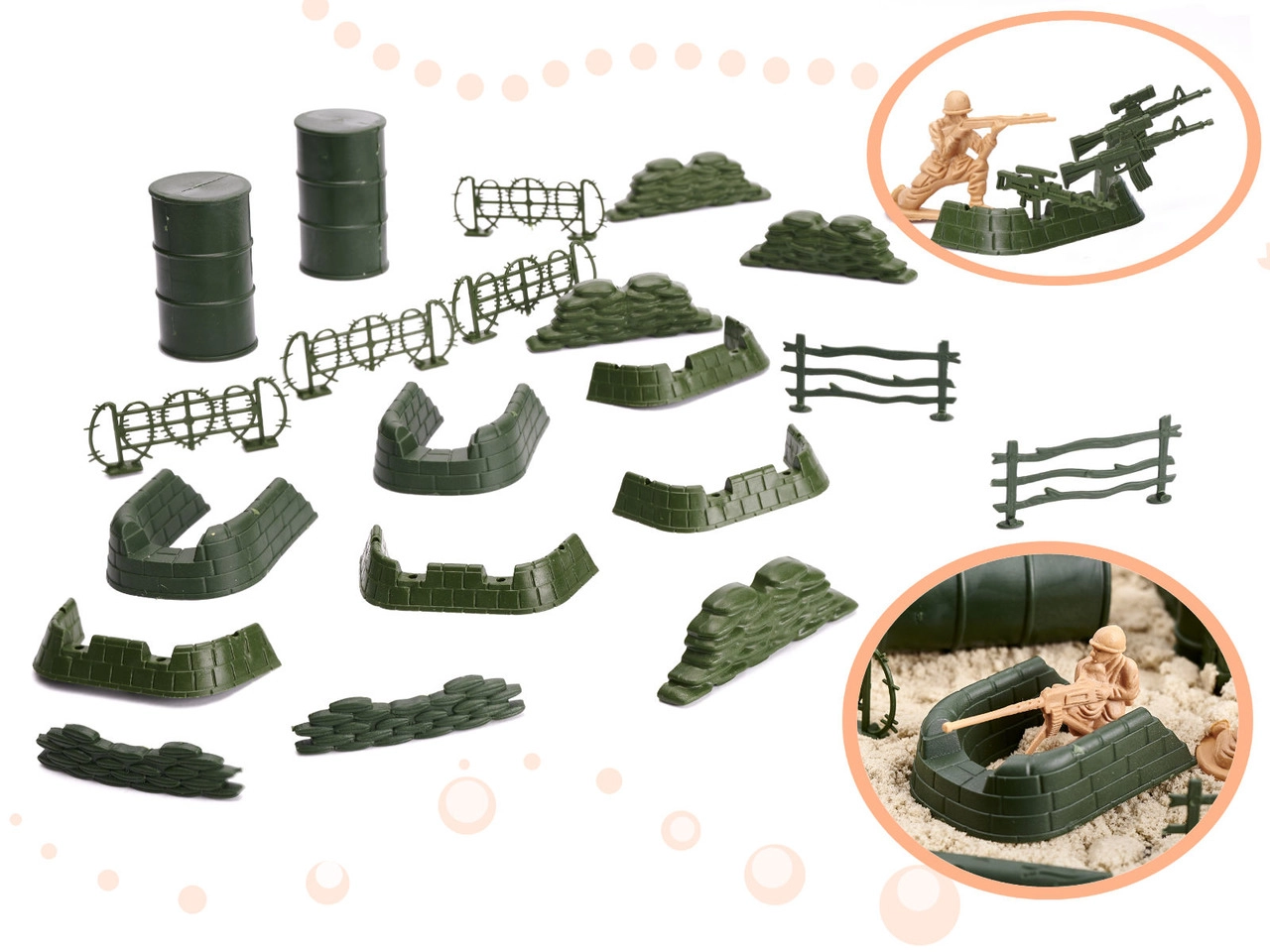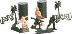 Incluye alrededor de 60 figuras de soldados en diferentes posiciones y abundantes componentes para construir una base militar: barriles, vallas, obstáculos, palmeras y más. Las figuras miden aprox. 5 cm de altura, se mantienen estables sobre superficies planas y se distribuyen con facilidad.