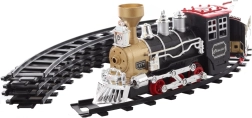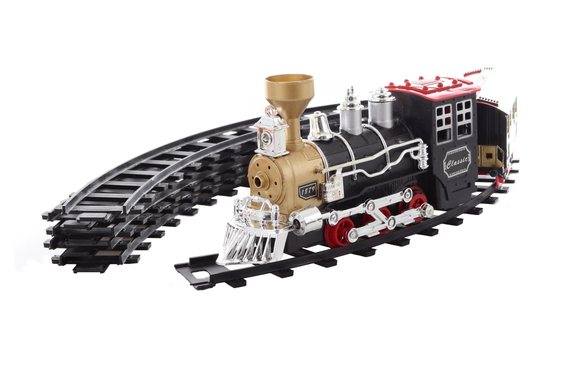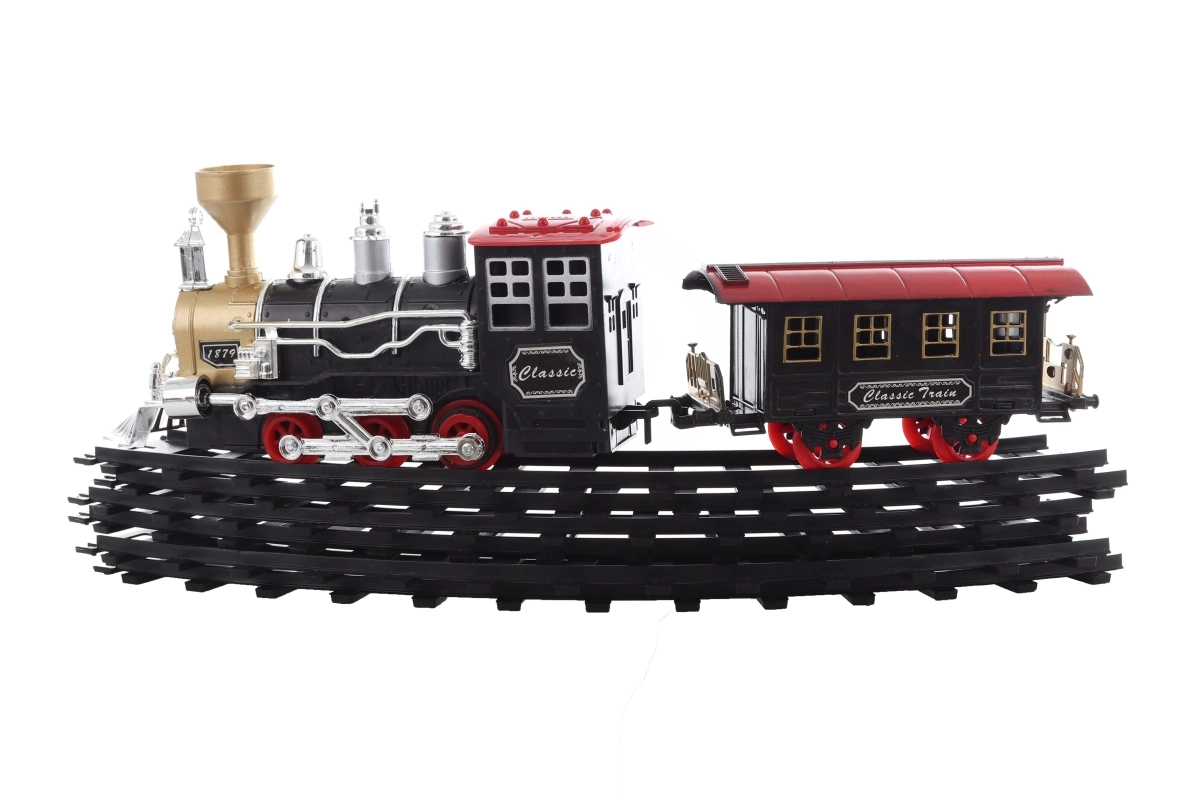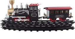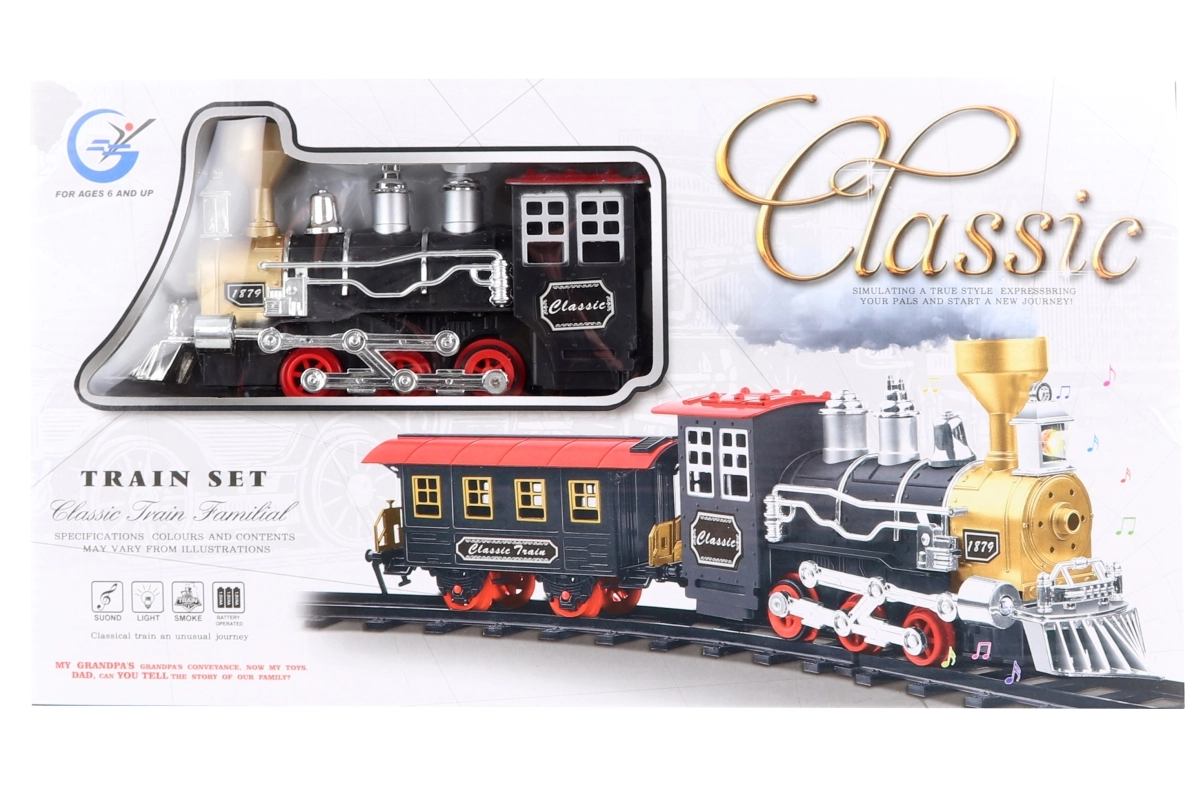 Esta increíble vía de tren ofrece una diversión perfecta para niños y aficionados a los trenes de todas las edades. La locomotora se ilumina, emite sonidos e incluso echa humo, lo que añade una experiencia de conducción más realista. Gracias a su acabado detallado y al diseño retro con acentos en negro y dorado, el tren es el complemento perfecto para cualquier maqueta doméstica.