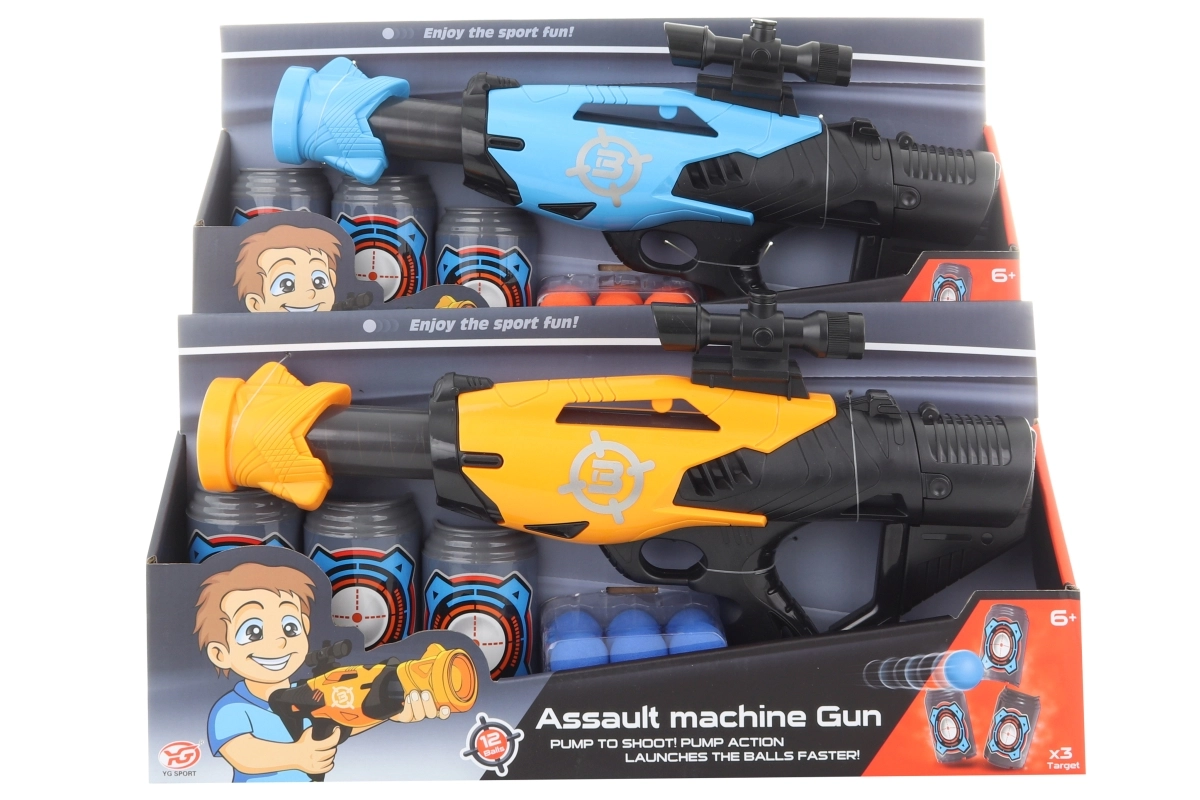 Esta pistola de plástico para bolas de espuma es ideal para niños que aman los juegos de acción. El paquete incluye tres latas de plástico con diana y doce bolas, que permiten crear y montar distintos desafíos. La pistola está diseñada para ser ligera y fácil de manejar.