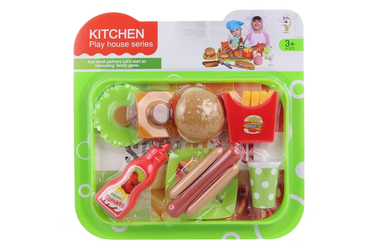 Este set de juego de comida rápida encantará a todos los pequeños amantes de cocinar y atender. La hamburguesa se puede desmontar fácilmente en sus ingredientes (pan, lechuga, filete, queso, tomate, mayonesa), para que los niños puedan montar su propio “menú” y desarrollar la imaginación y las habilidades.