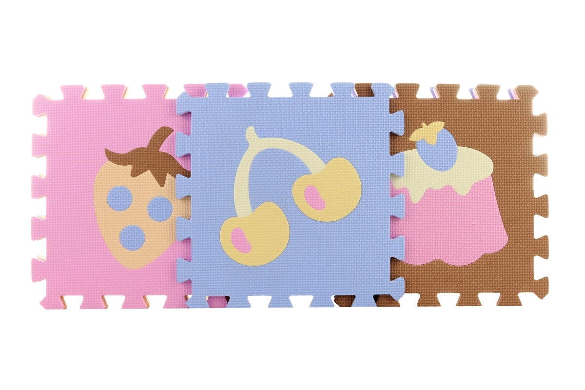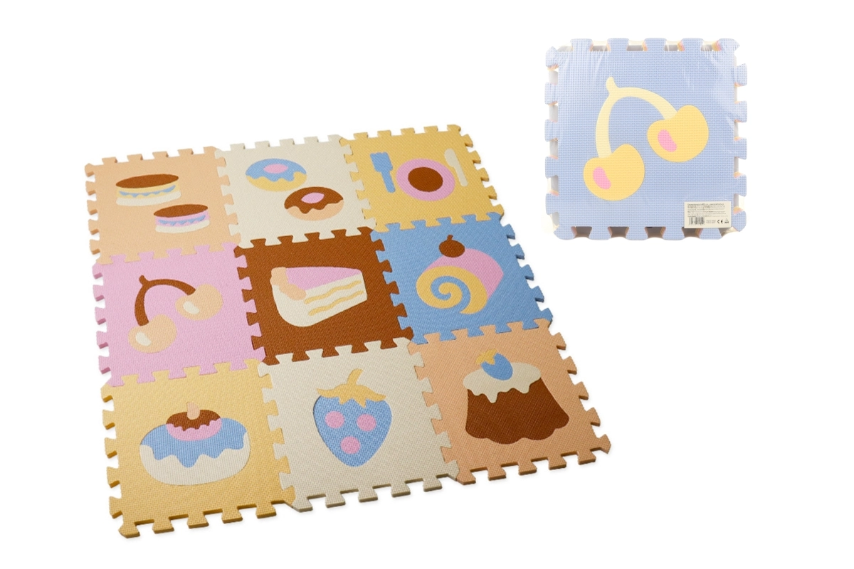 Adorable alfombra de espuma infantil con motivo de delicias, frutas y postres, que crea un espacio de juego seguro y suave. Amortigua el ruido, aísla del frío, es lavable y gracias a su superficie estriada no resbala. El paquete incluye 9 piezas cuadradas de 28 × 28 cm y un grosor de 0,7 cm.