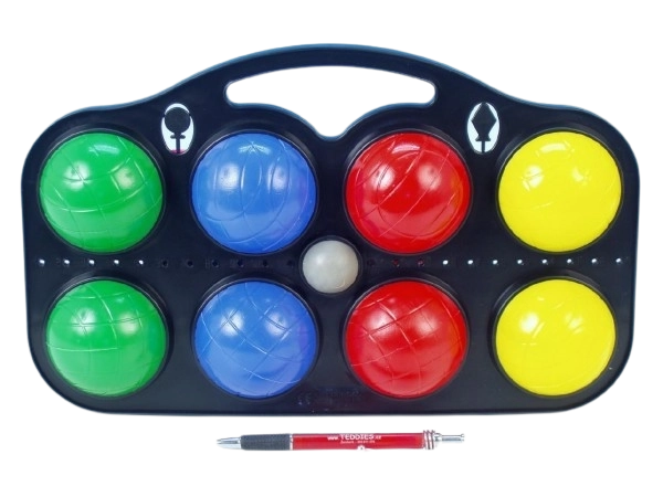 Juego de ocho bolas de petanca de plástico, ideal para actividades divertidas al aire libre. Cada bola tiene un color único para una fácil identificación durante el juego. Este set se entrega en un embalaje práctico que facilita tanto el almacenamiento como el transporte de las bolas.