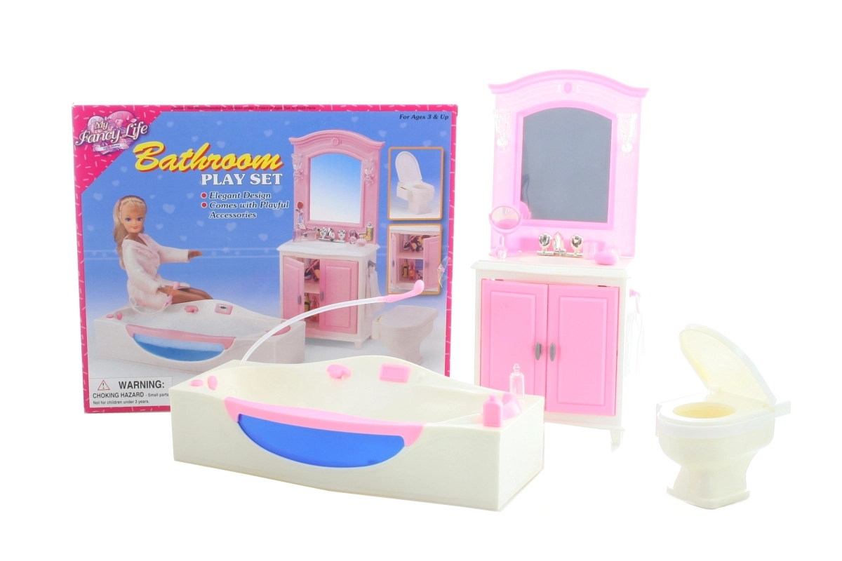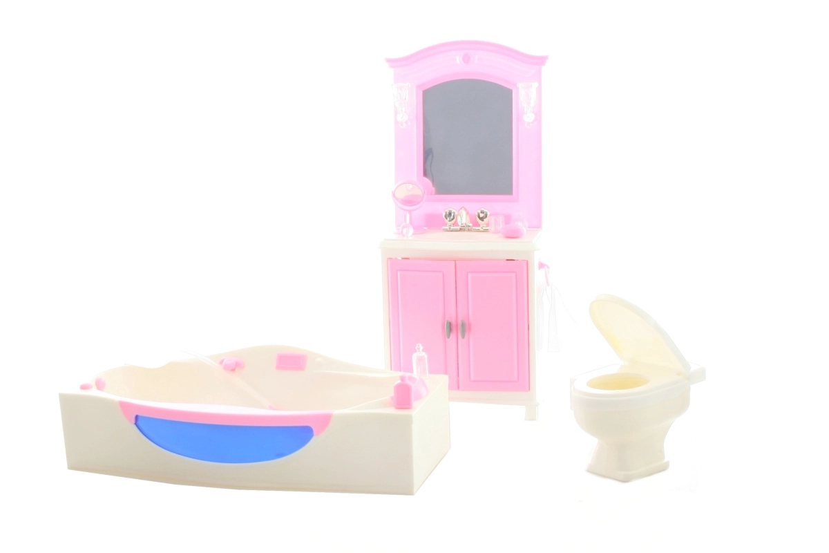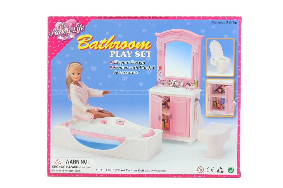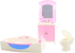 El contenido del paquete incluye un tocador con lavabo, una bañera y un inodoro, así como pequeños accesorios que recrean la atmósfera de un baño real. La fabricación en plástico garantiza un mantenimiento sencillo y una larga durabilidad durante el juego diario.