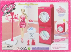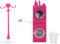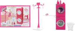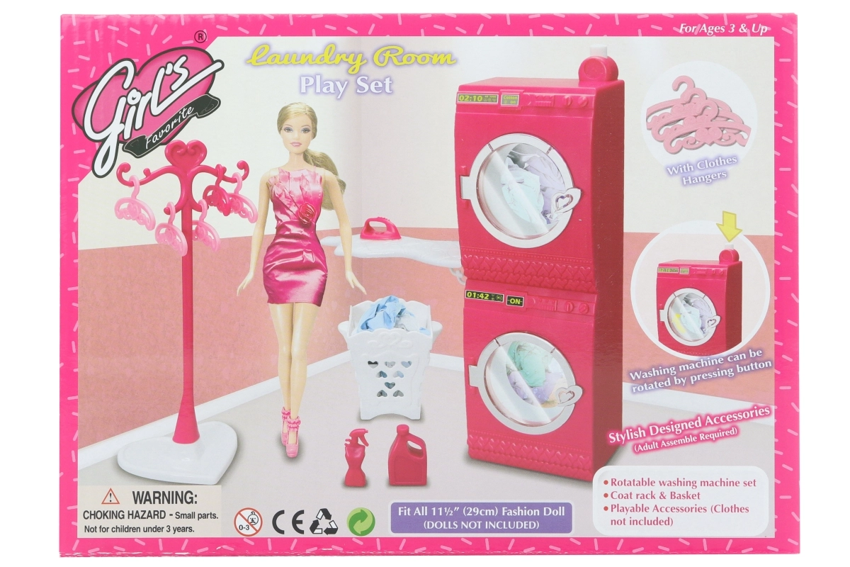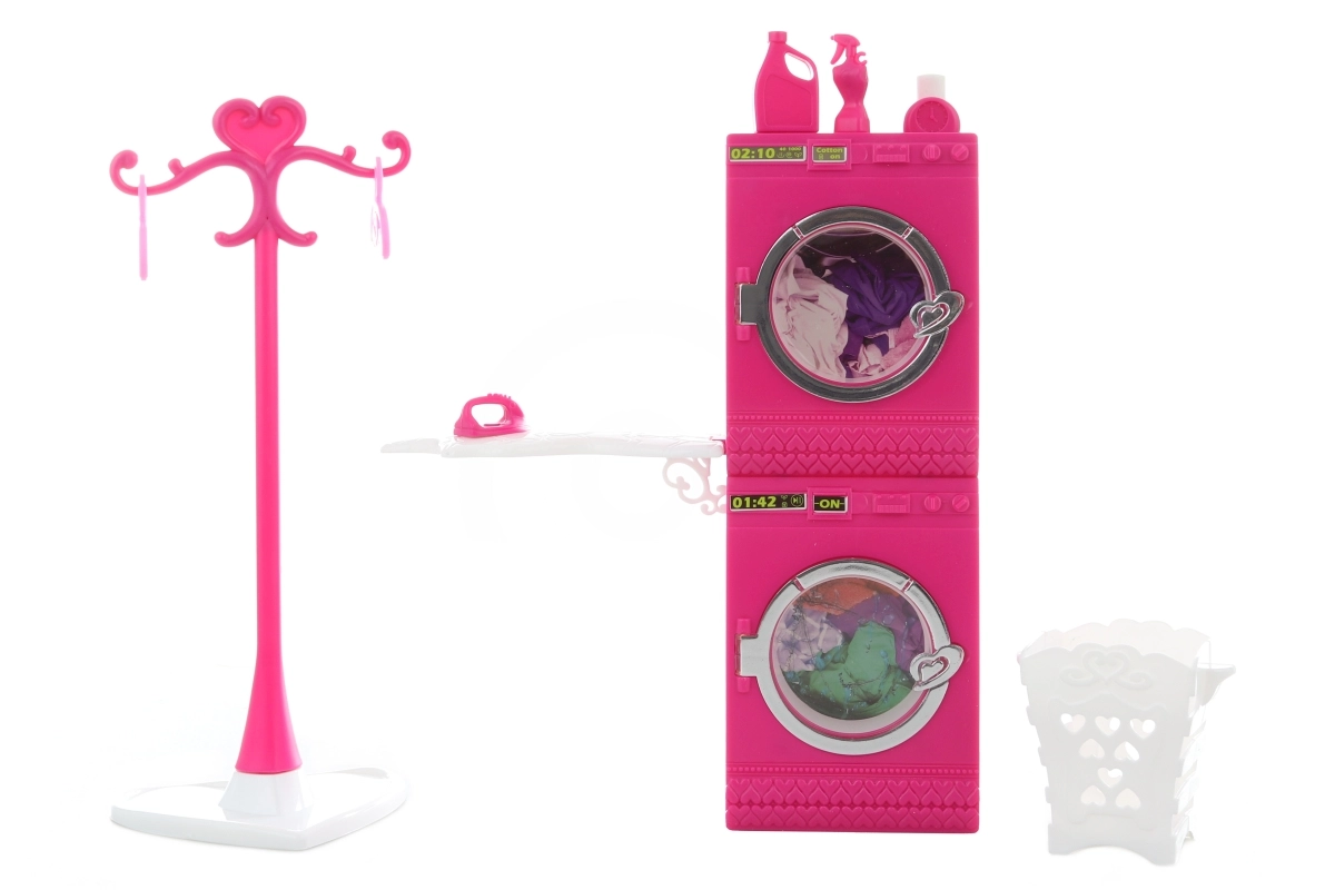 Brinda a los niños un juego realista con el completo set Glorie lavandería. El set incluye una lavadora que gira al presionar el botón, secadora, tabla de planchar, perchero, cesto para la ropa y perchas. Complemento ideal para casas de muñecas a partir de 3 años.