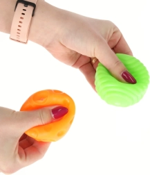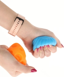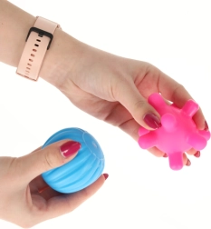 Las pelotas son aptas para jugar en seco y en el agua. Las texturas son ideales para un suave masaje de manos y pies y aportan calma.