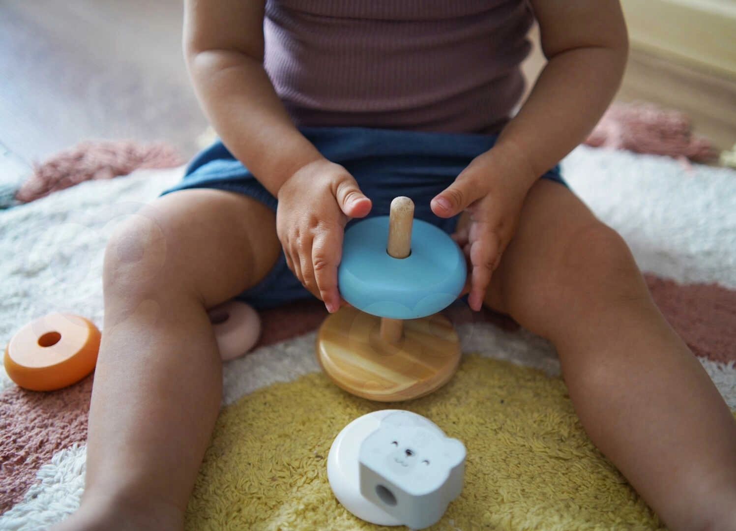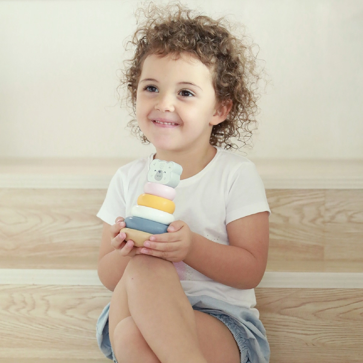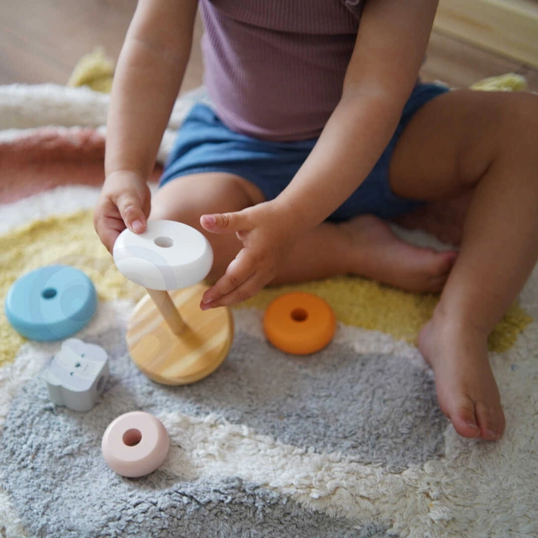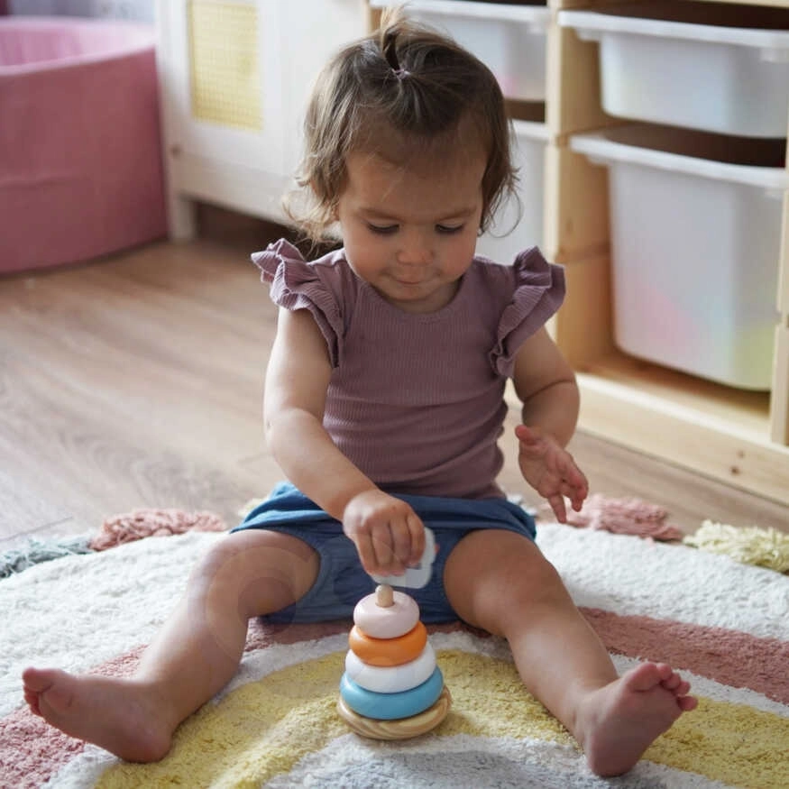 Encajar los anillos en la base no solo aporta alegría a los niños, sino que también desarrolla su coordinación y su pensamiento lógico. Además, aprenden a reconocer colores y a trabajar con diferentes formas.