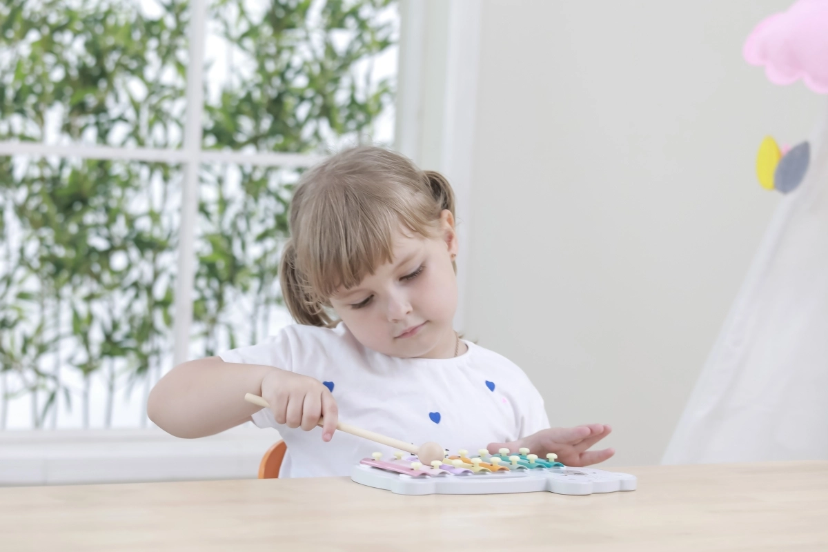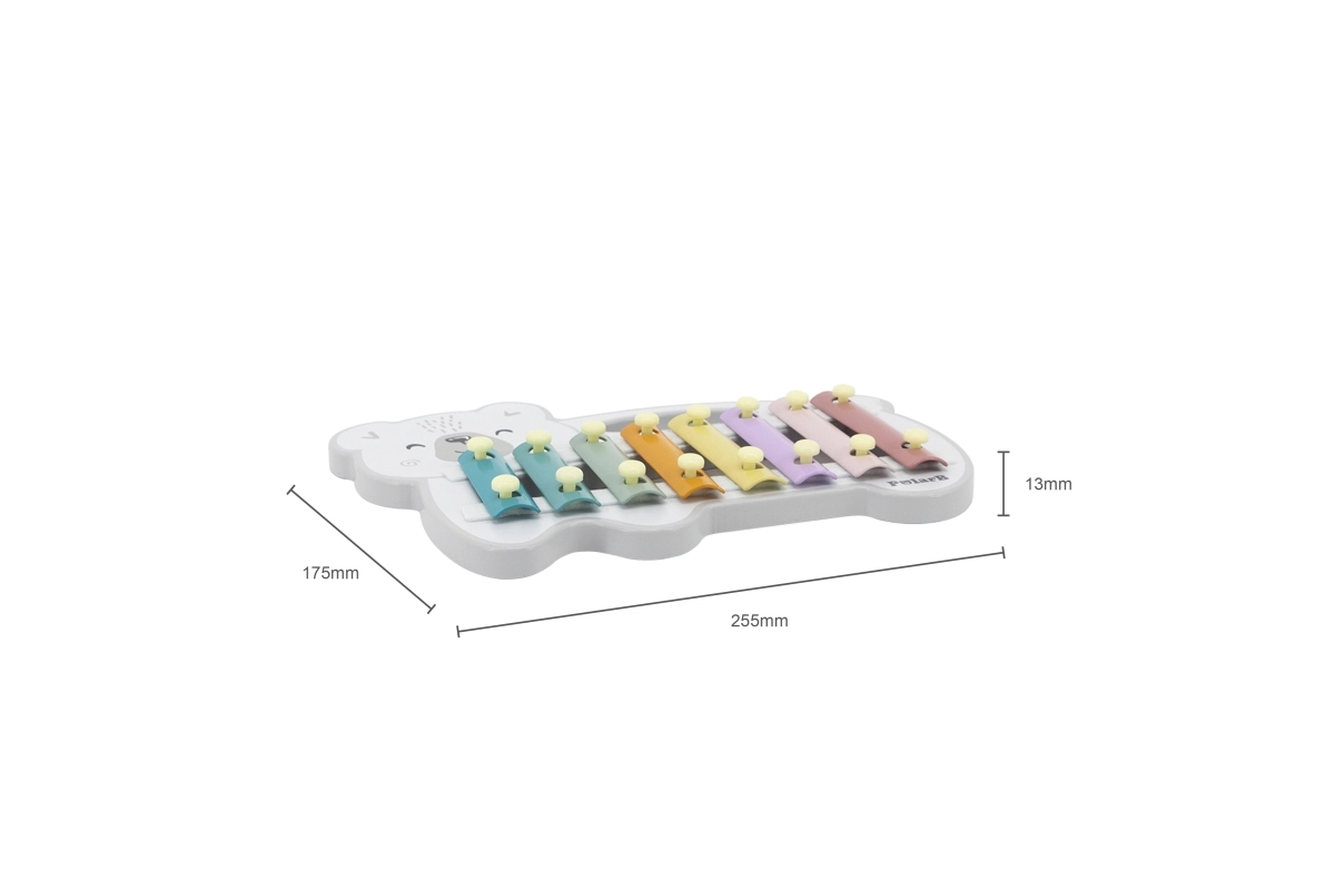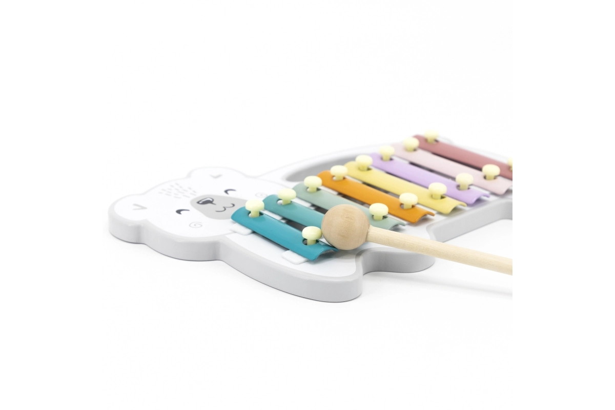 El xilófono de madera con forma de oso polar combina una estética lúdica con un instrumento musical funcional. Las láminas metálicas en colores pastel producen tonos agradables al golpear con la baqueta de madera, motivando de forma natural a los niños a experimentar con sonidos y ritmo.