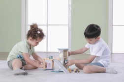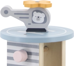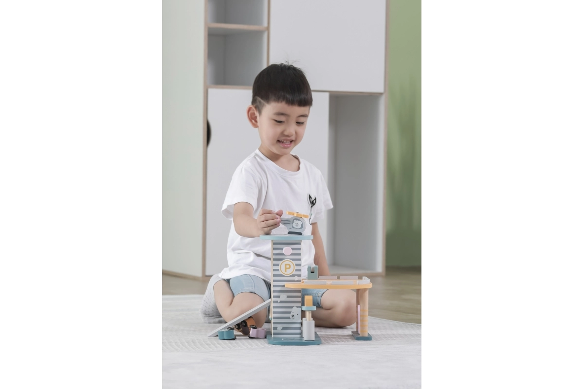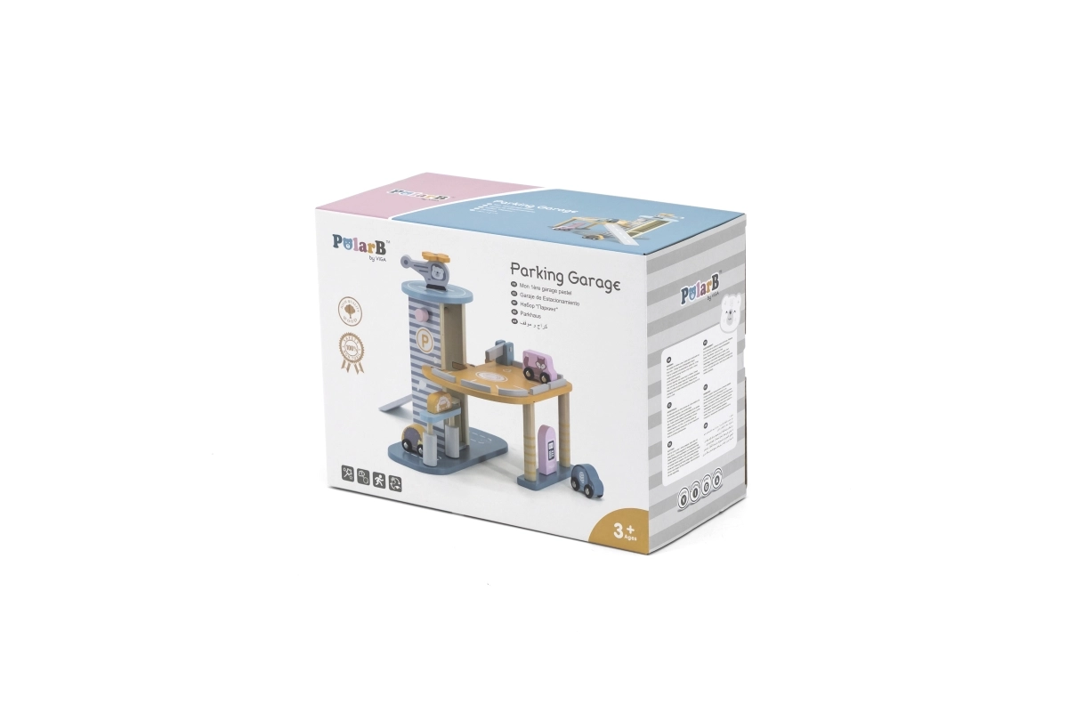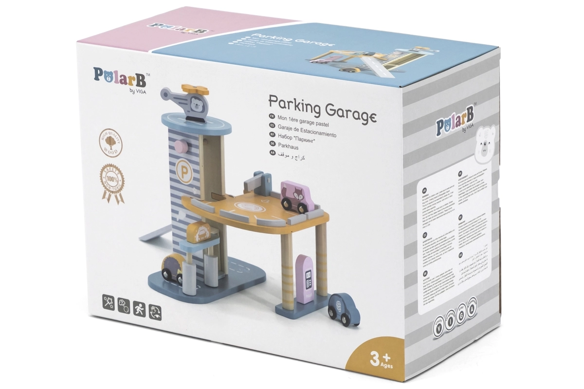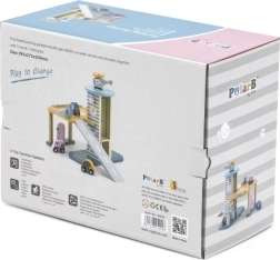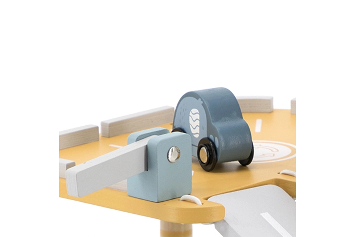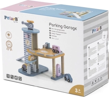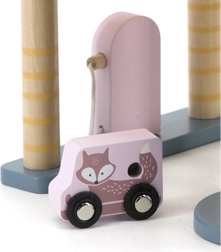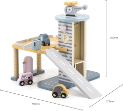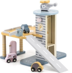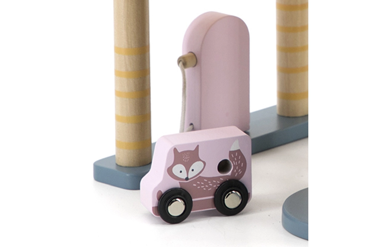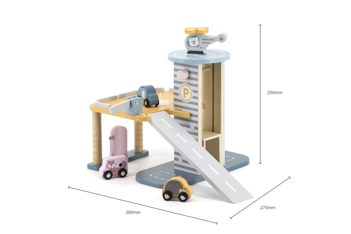 El garaje de madera con helicóptero y coches es un juguete fantástico que apoya la creatividad y el desarrollo de las habilidades motoras de los niños. Este juguete interactivo está equipado con lavadero de coches, gasolinera y ascensor. El set incluye tres cochecitos y un helicóptero, todo en colores suaves que combinan con cualquier habitación infantil.