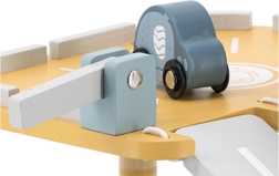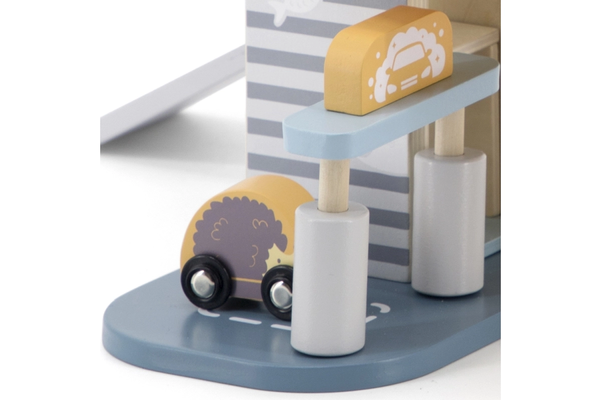 El garaje de madera ofrece muchas posibilidades de juego interactivo gracias a funciones integradas como el lavadero, la gasolinera y el ascensor.