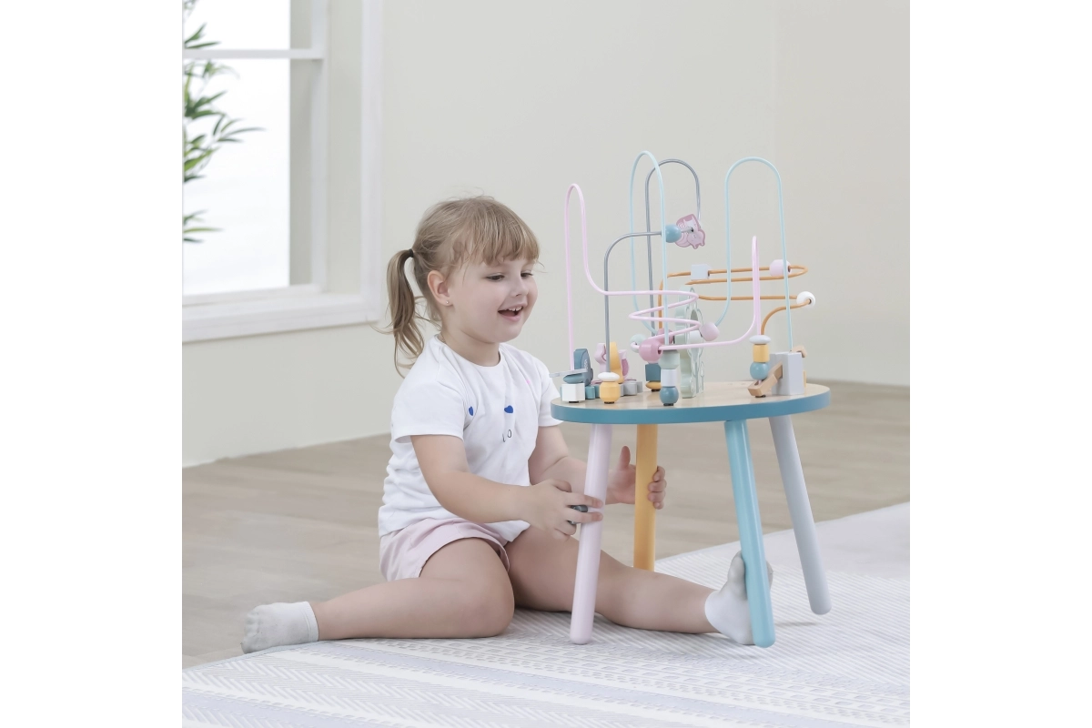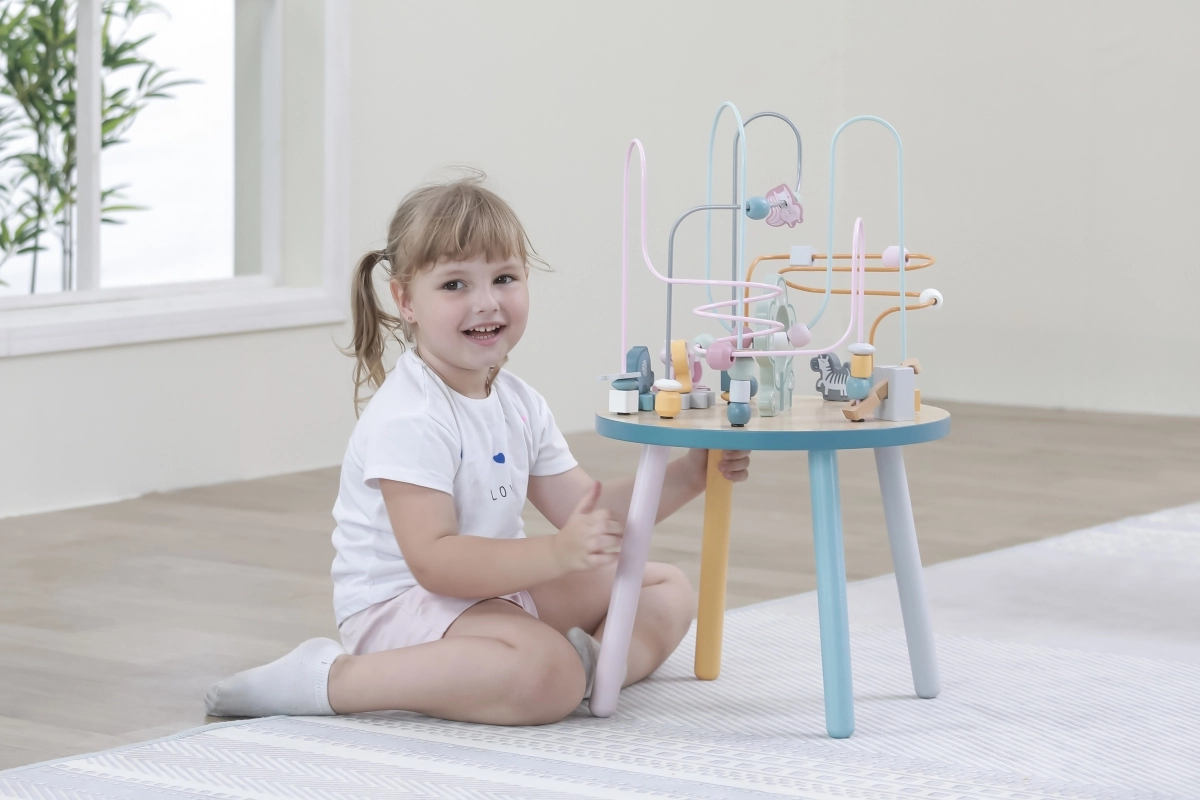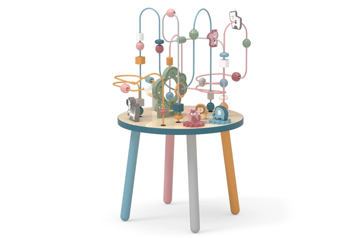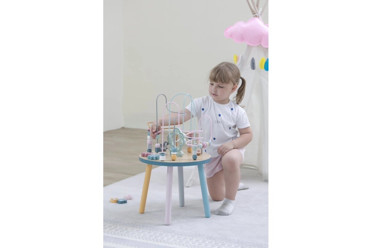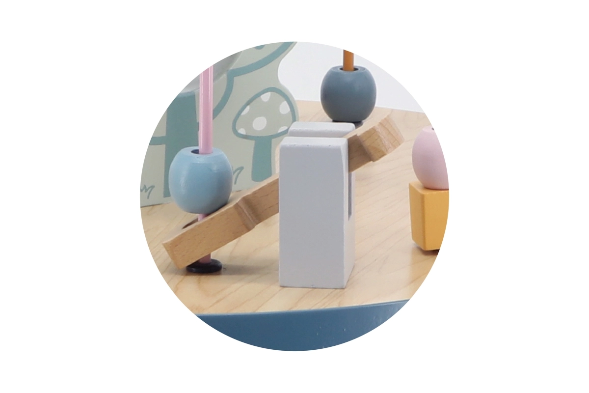 El laberinto de cuentas sobre la resistente mesa de madera invita a los niños a explorar. Las formas de colores y los adorables animalitos (osito, zorro, erizo) motivan el movimiento de los deditos, el agarre preciso y la creación de historias propias. Una elección ideal para un enfoque “Montessori” en casa, aprendiendo a través del juego que desarrolla paciencia, concentración e imaginación.