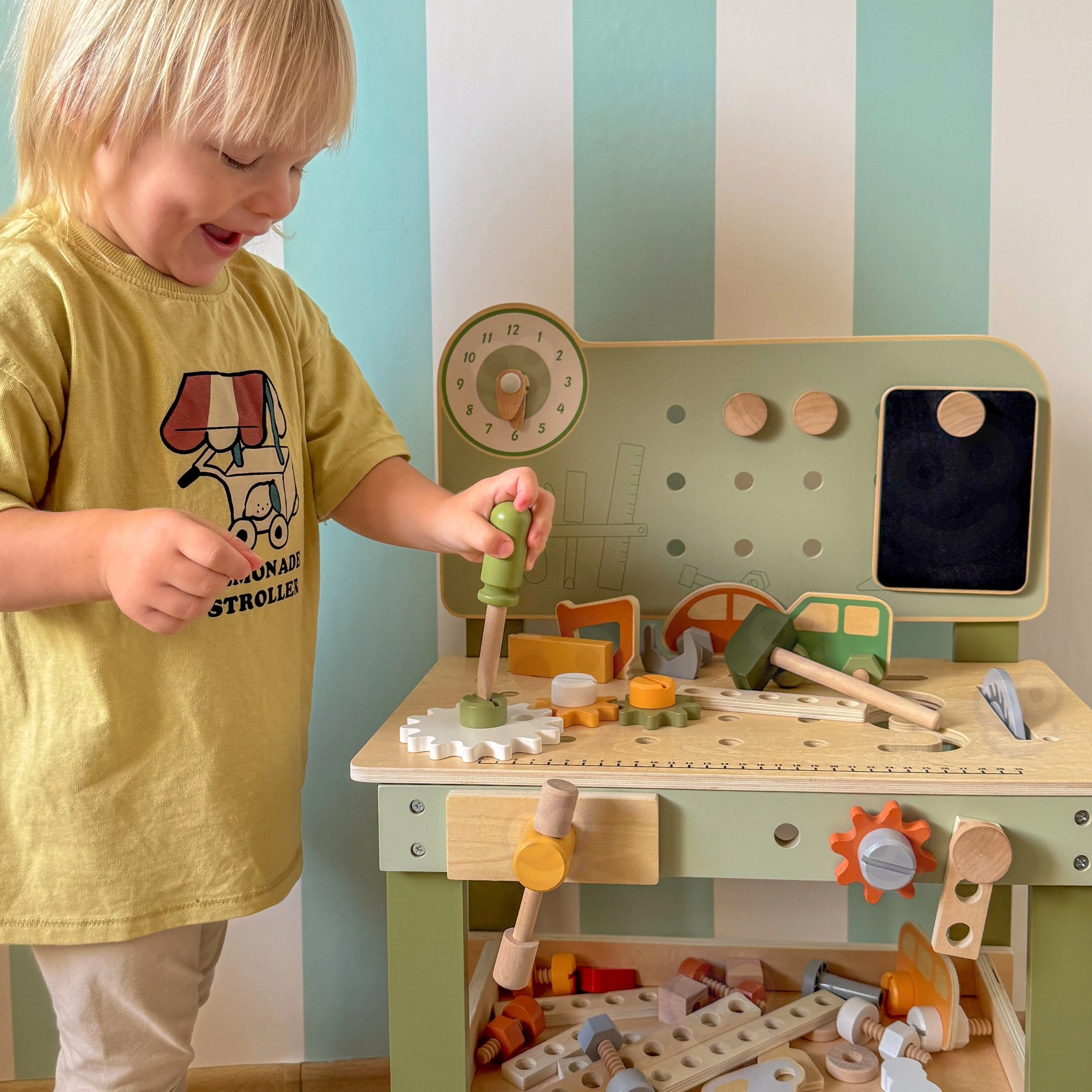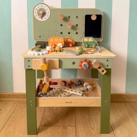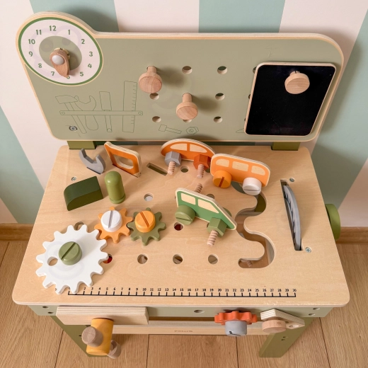 Incluye un set de herramientas (martillo, llave, destornillador), tornillos, tuercas y engranajes, panel con reloj educativo y una práctica repisa para dejar objetos. Los niños pueden montar sus propias creaciones, “reparar” y clasificar piezas: ideal para desarrollar la creatividad, la paciencia y la planificación.