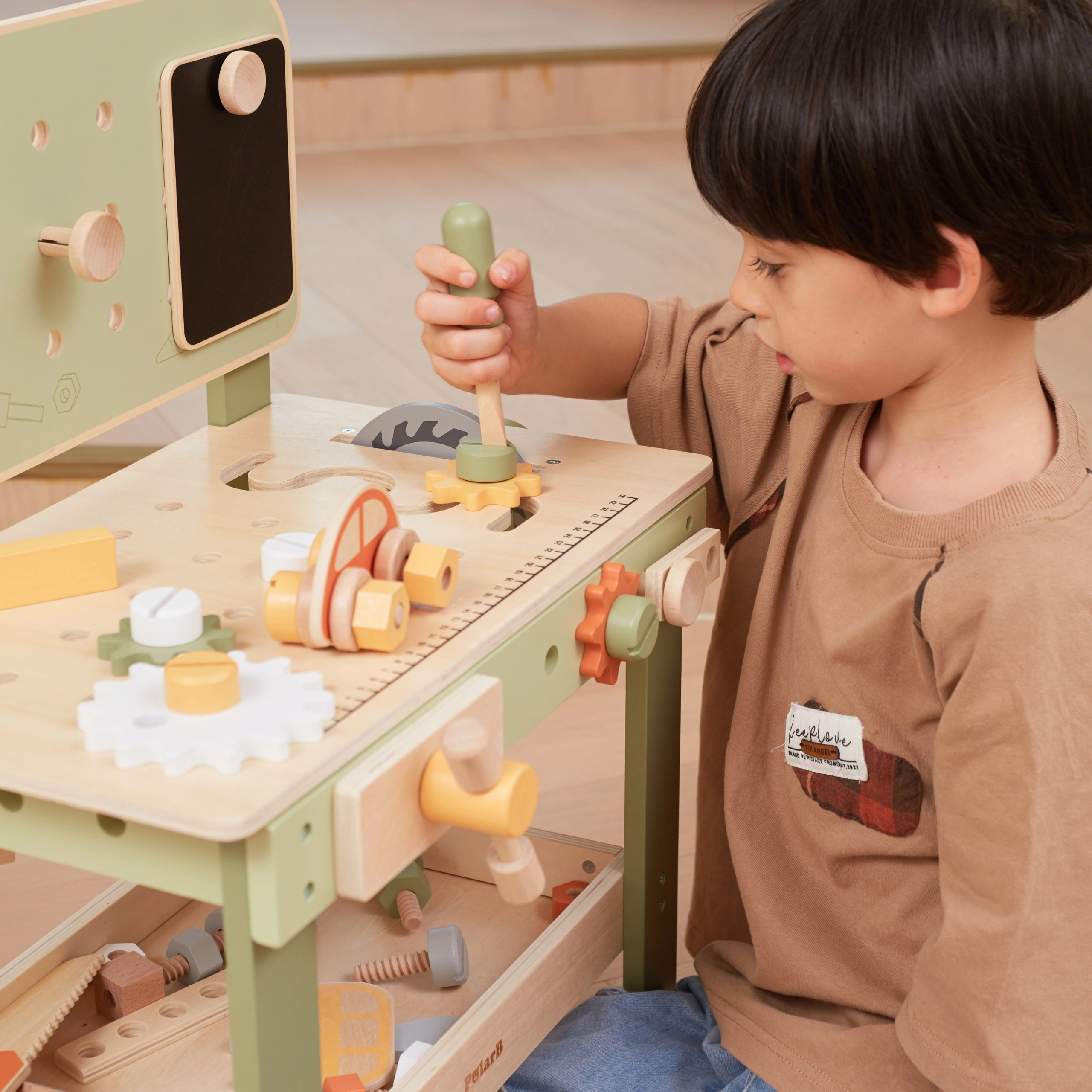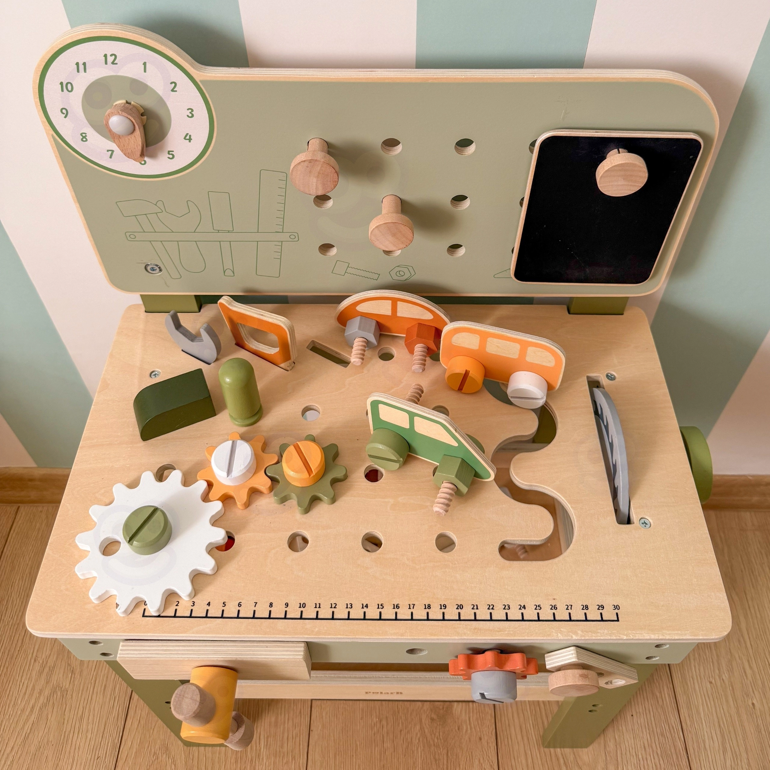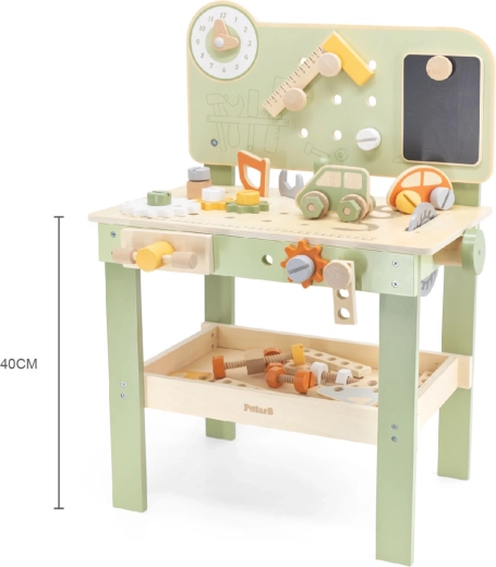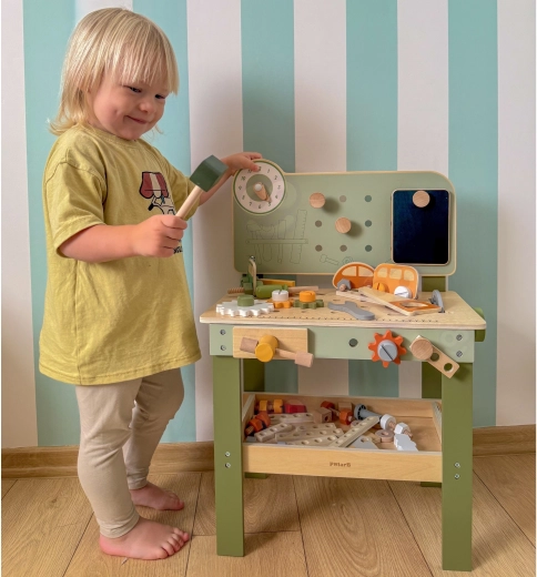 El banco con panel perforado, escala de medición y elementos giratorios fomenta el juego realista y el desarrollo de habilidades al trabajar con herramientas.