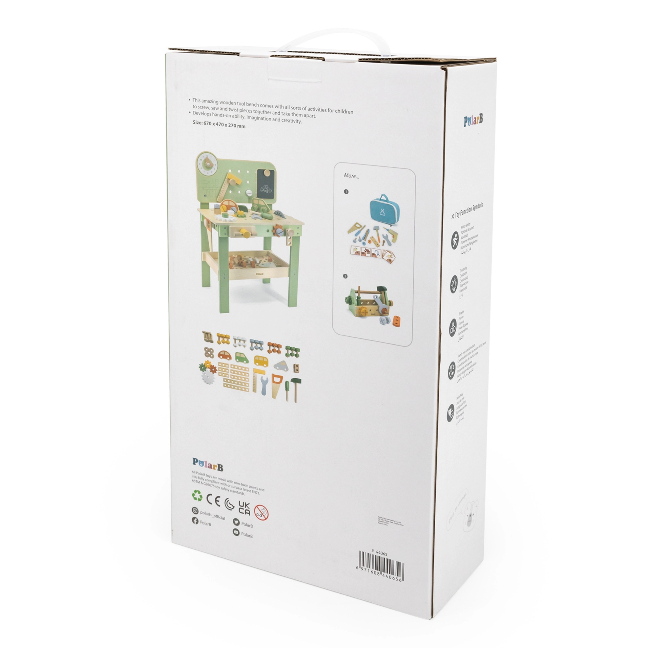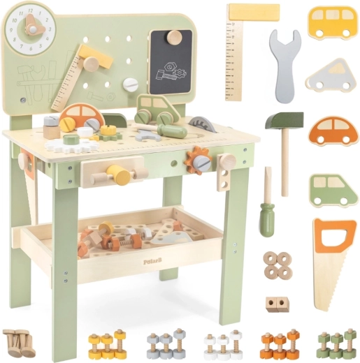 Descubre el robusto y estiloso banco Viga PolarB, diseñado para pequeños manitas a partir de 3 años. Gracias a su estructura de madera, engranajes que giran suavemente y abundantes accesorios, los niños entrenan la coordinación ojo–mano y aprenden a resolver tareas jugando. Los materiales seguros y los detalles bien pensados aseguran una larga durabilidad y un almacenamiento cómodo de las piezas.
