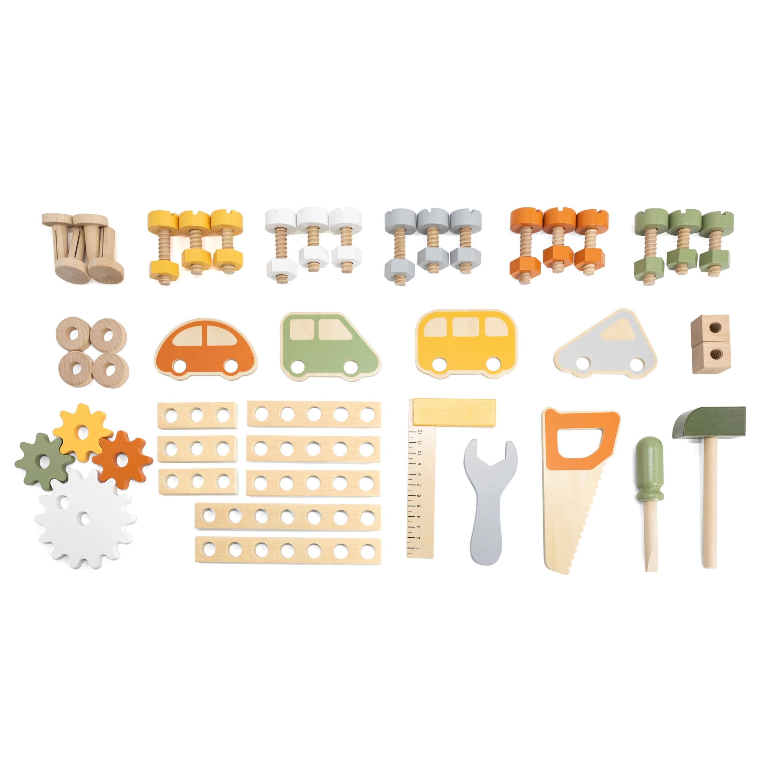 Tornillos, tuercas, listones, engranajes y herramientas dan a los niños libertad para construir, combinar y explorar principios mecánicos.