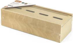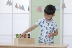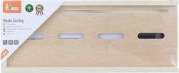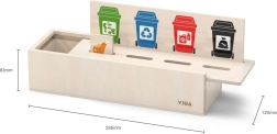 El juguete enseña a los niños a clasificar correctamente los residuos mediante divertidas fichas de madera y cubos identificados por colores.