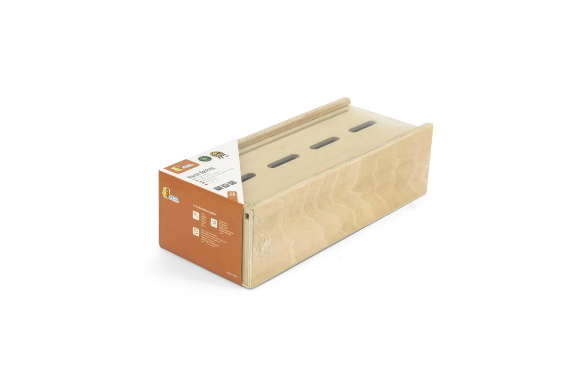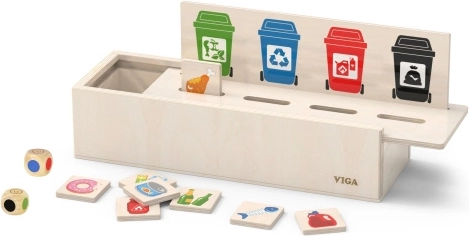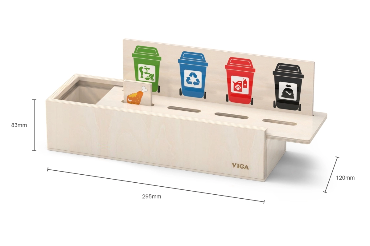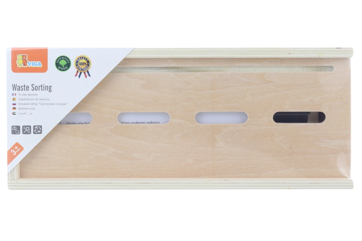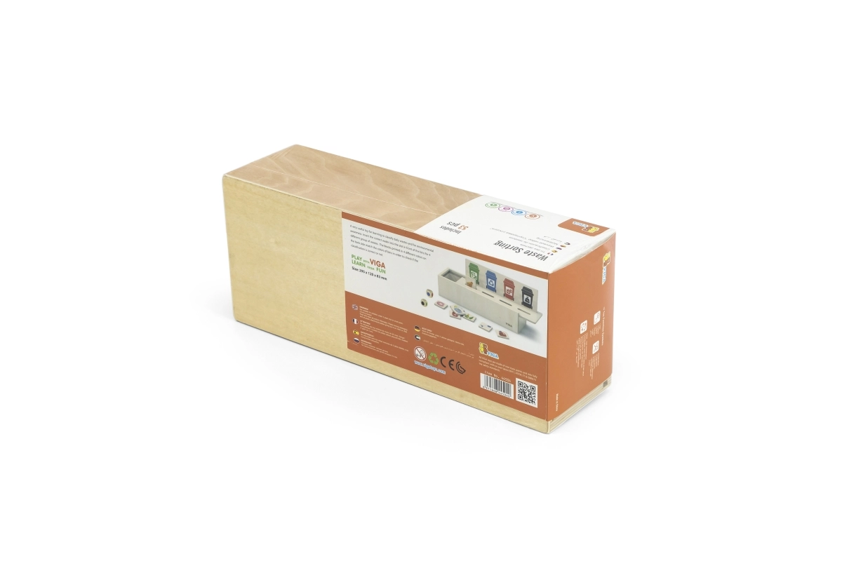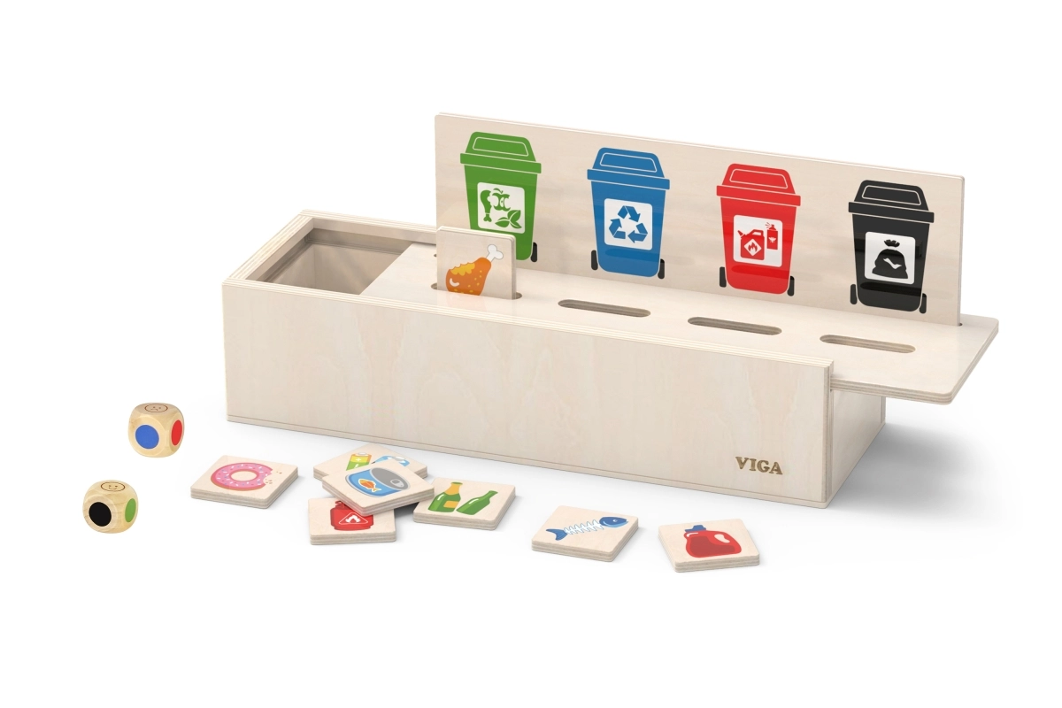 Este juguete educativo de VIGA es ideal para niños que están aprendiendo los fundamentos de la clasificación de residuos. Incluye una caja de madera con aberturas para insertar fichas y una tabla con diferentes cubos de basura. También incluye 50 fichas de madera con imágenes de residuos y colores correspondientes a categorías de reciclaje.