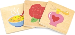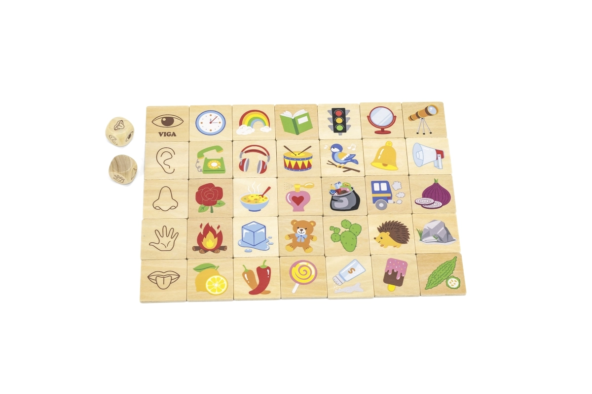 VIGA juego educativo rompecabezas de madera ofrece una forma ideal para que los niños desarrollen su pensamiento y coordinación. La tarea consiste en asociar objetos con los sentidos seleccionados, lo que incluye diversos elementos cotidianos.