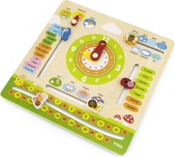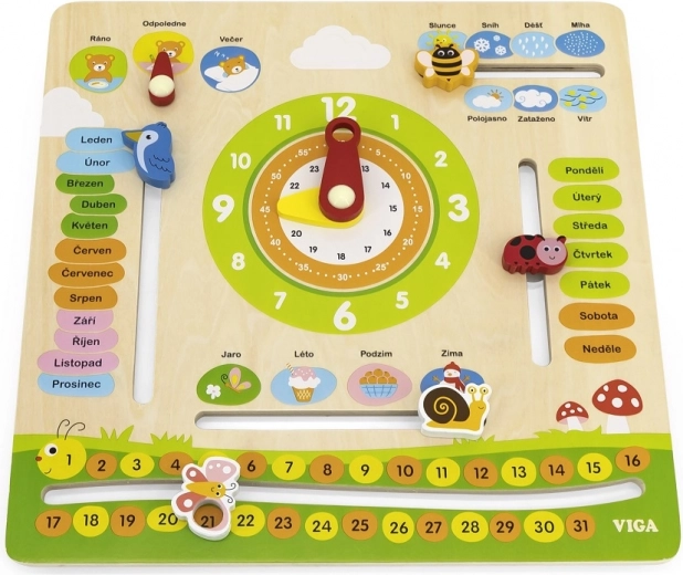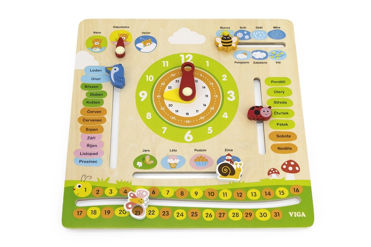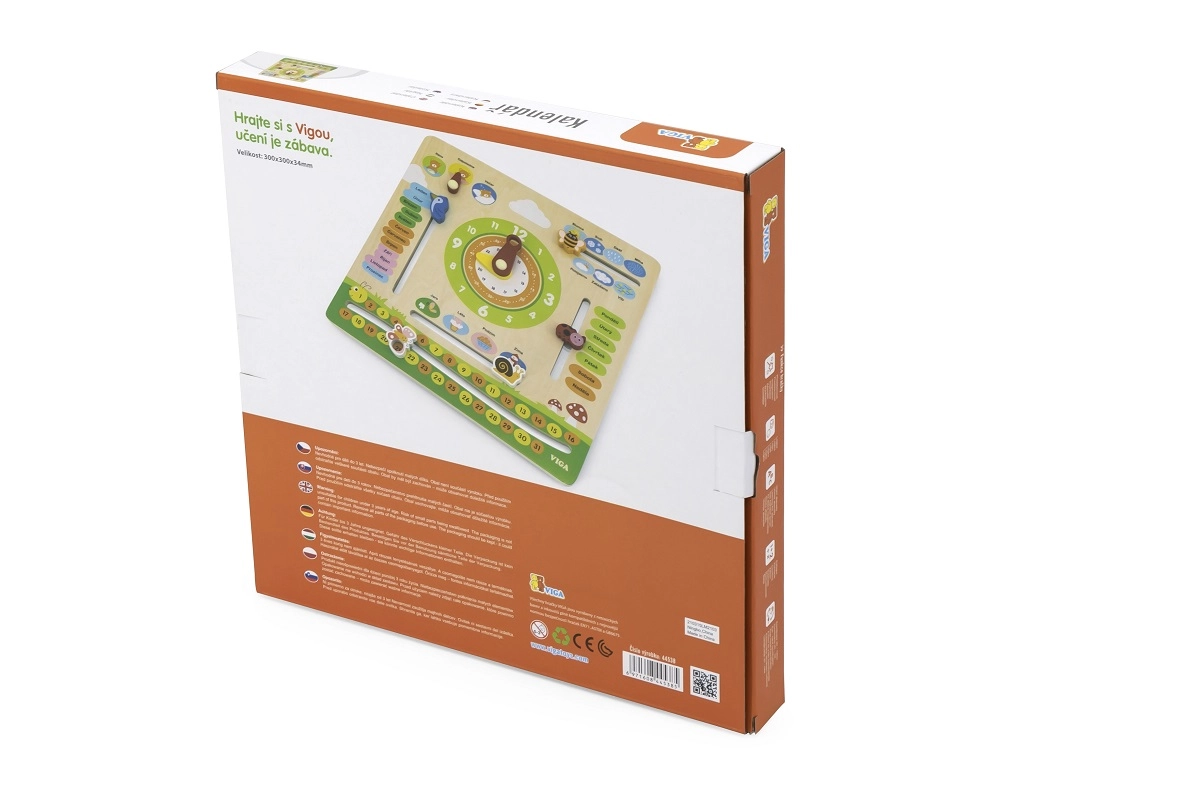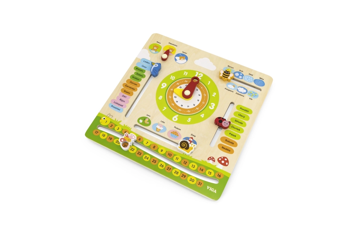 El inteligente y divertido calendario de madera VIGA en idioma checo ayuda a los niños a aprender de forma lúdica los meses, días de la semana, horas, estaciones del año, clima, números y partes del día. Las manecillas y los indicadores móviles fomentan la motricidad fina y la exploración autónoma.