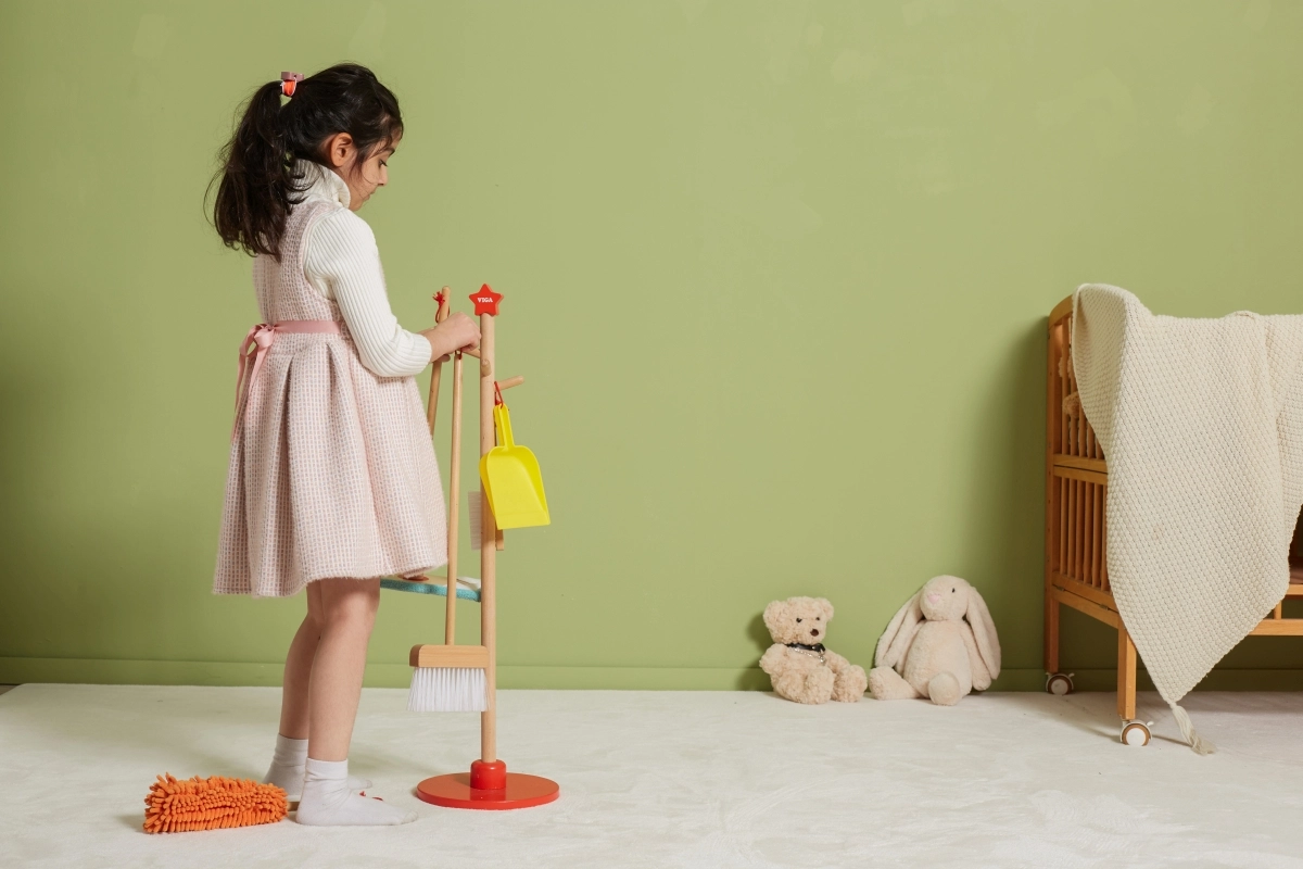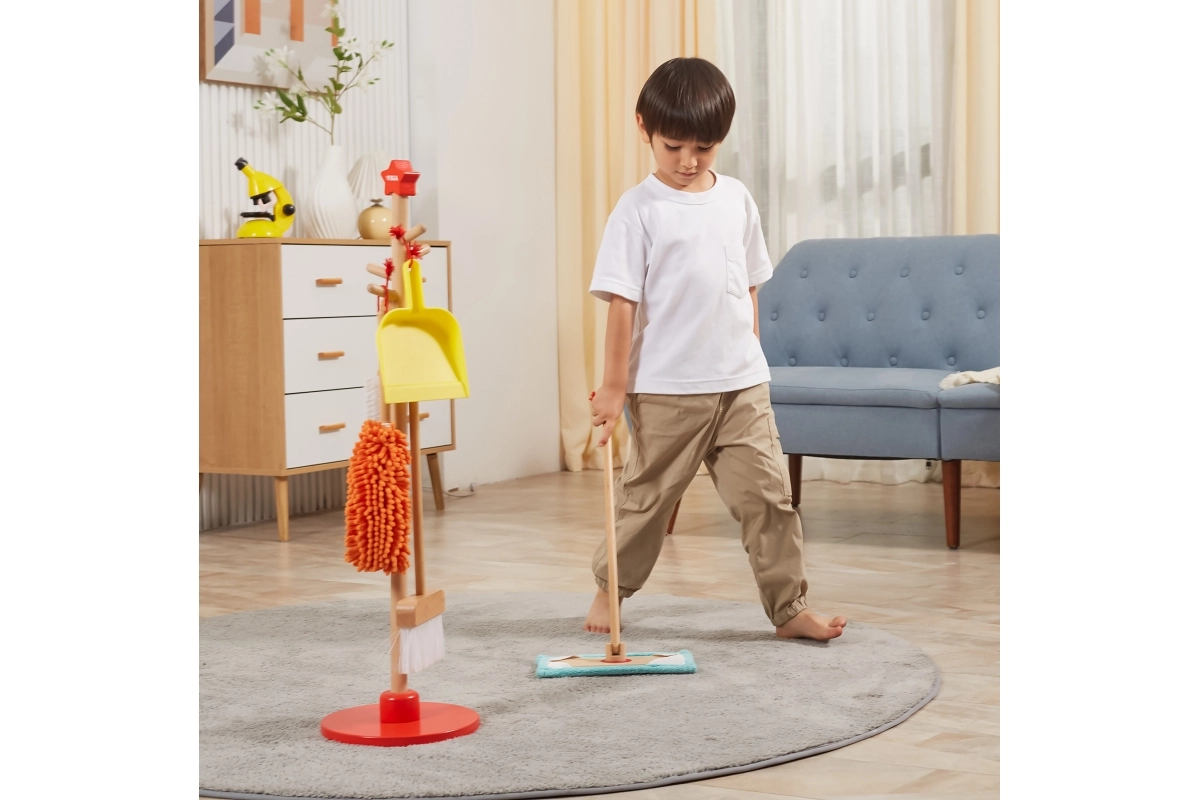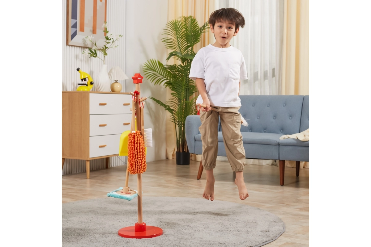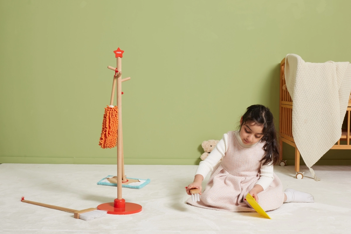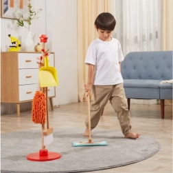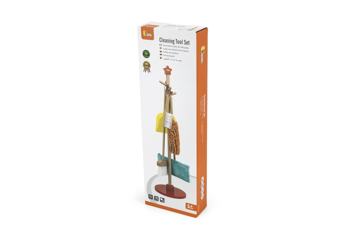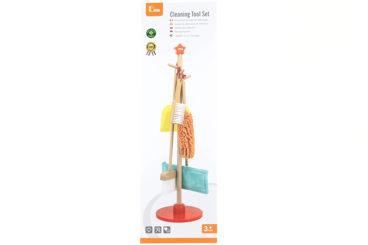 El juego de limpieza de madera Viga es ideal para pequeños ayudantes que quieren participar activamente en mantener el orden. Gracias a este set, que incluye escoba, fregona, plumero y otras herramientas, los niños desarrollan sus habilidades motoras y aprenden responsabilidad mientras juegan.