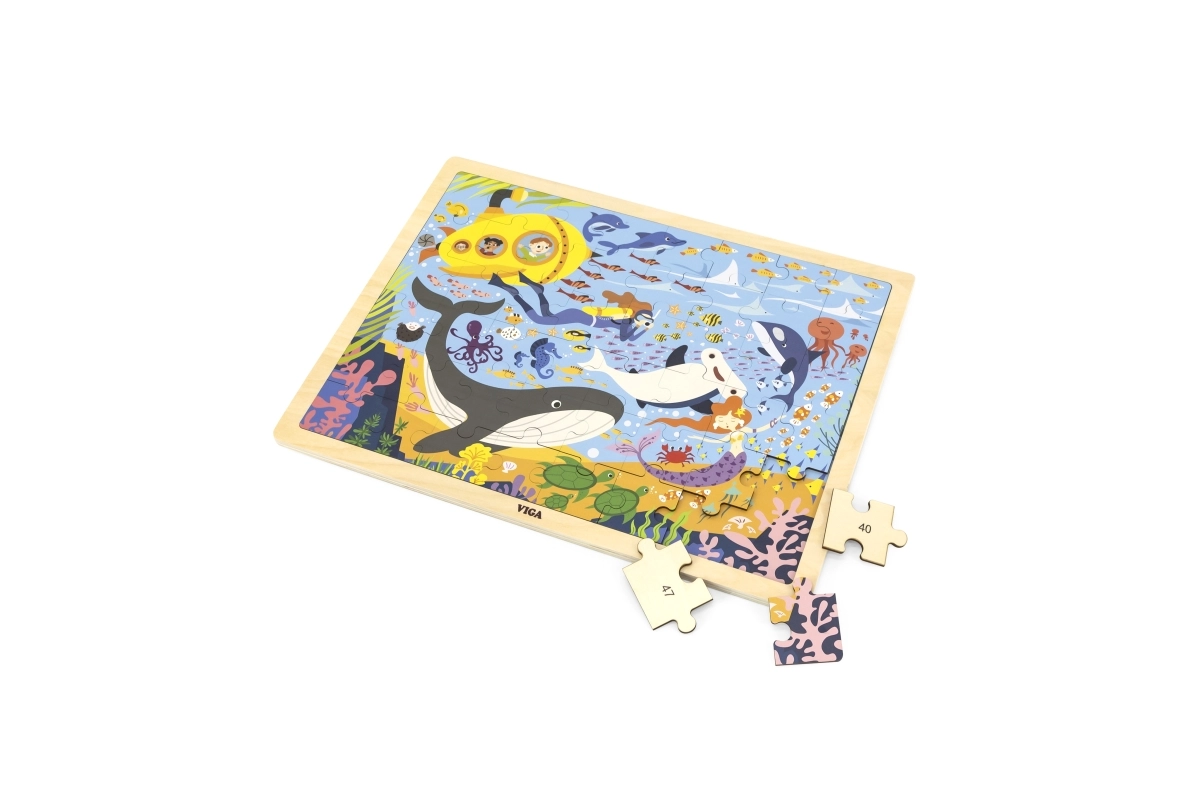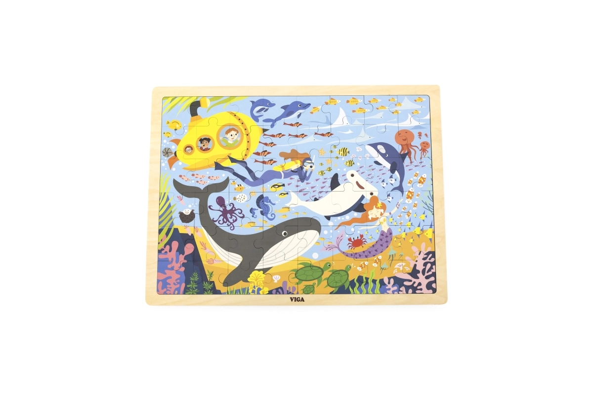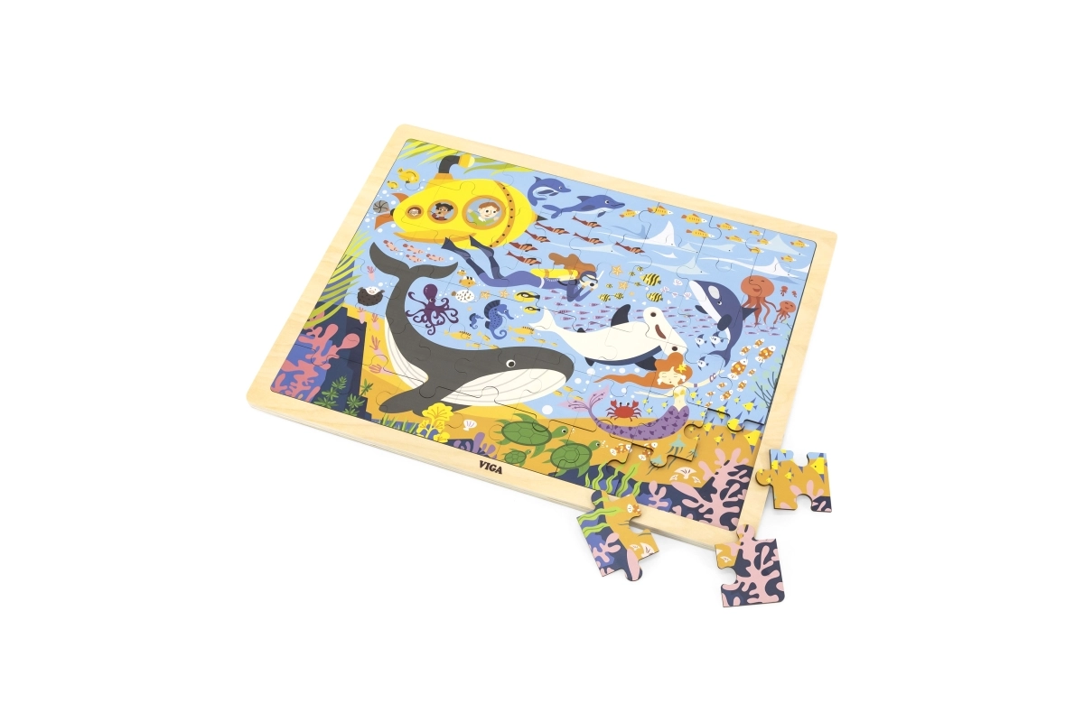 Con el rompecabezas de madera Vida Marina descubrirás una asombrosa variedad de criaturas marinas, como ballenas y pececitos, todo ello incluyendo un submarino amarillo.