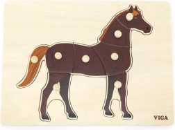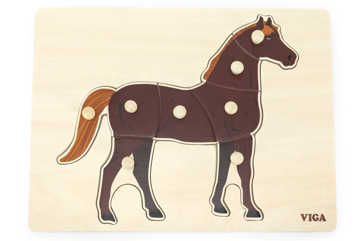 El encaje Montessori con un motivo realista de caballo invita a los niños a descubrir por sí mismos y a concentrarse. Gracias a las prácticas agarraderas, pueden sujetar fácilmente las piezas, aprender a reconocer formas y entrenar la precisión de los movimientos. El contraste entre la madera natural y el caballo marrón hace que los contornos sean claramente visibles y atractivos para el juego.