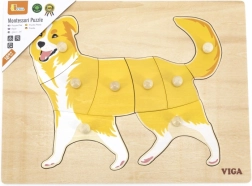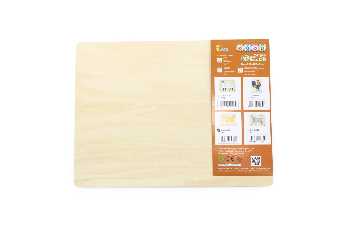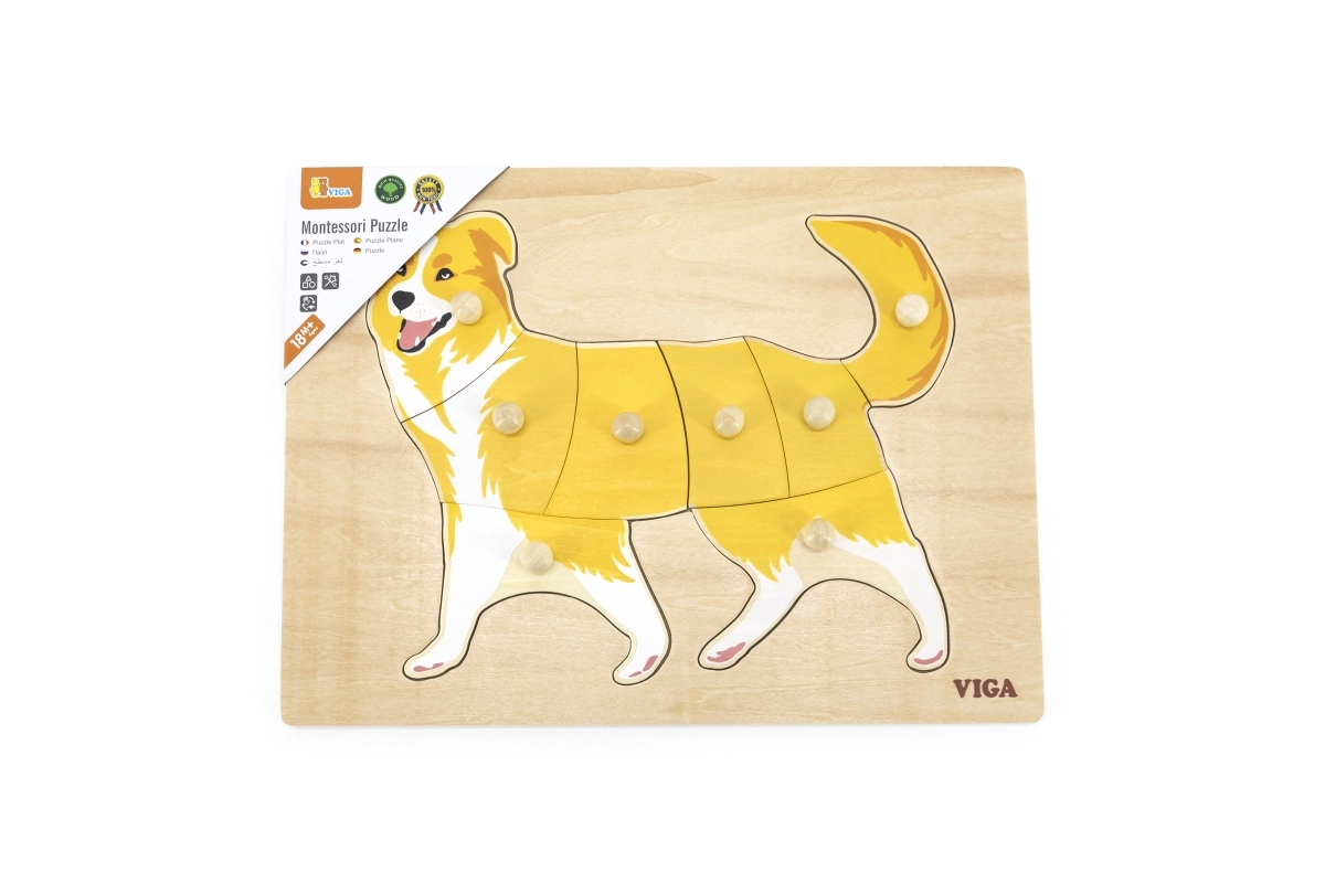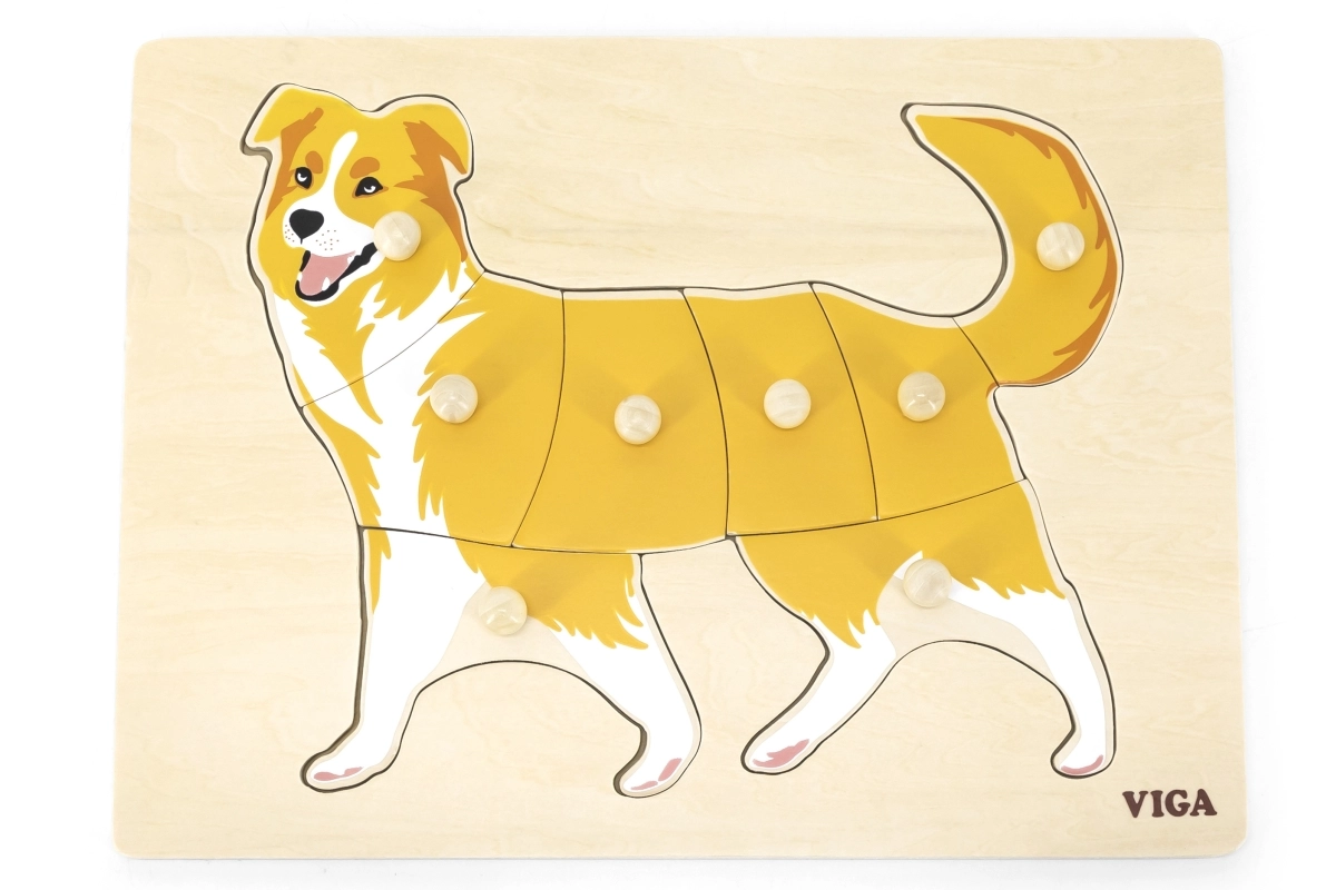La base de madera resistente y los bordes suaves garantizan un juego seguro y duradero en casa y en el jardín de infancia. El claro motivo del perro invita a encajar una y otra vez.