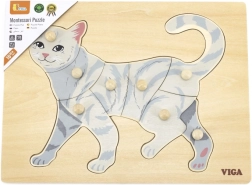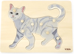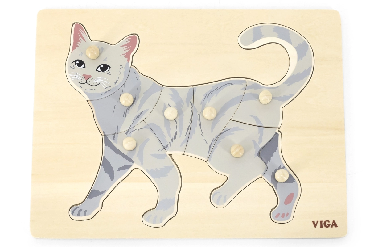 La tarea del niño es componer la imagen del gato no solo según la ilustración, sino también por la forma de cada pieza. Los pomos tipo botón facilitan el agarre con dedos pequeños y favorecen la correcta guía de la mano. El tablero de madera sólido mantiene las piezas firmes en su sitio y resiste el uso diario.