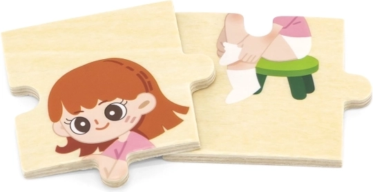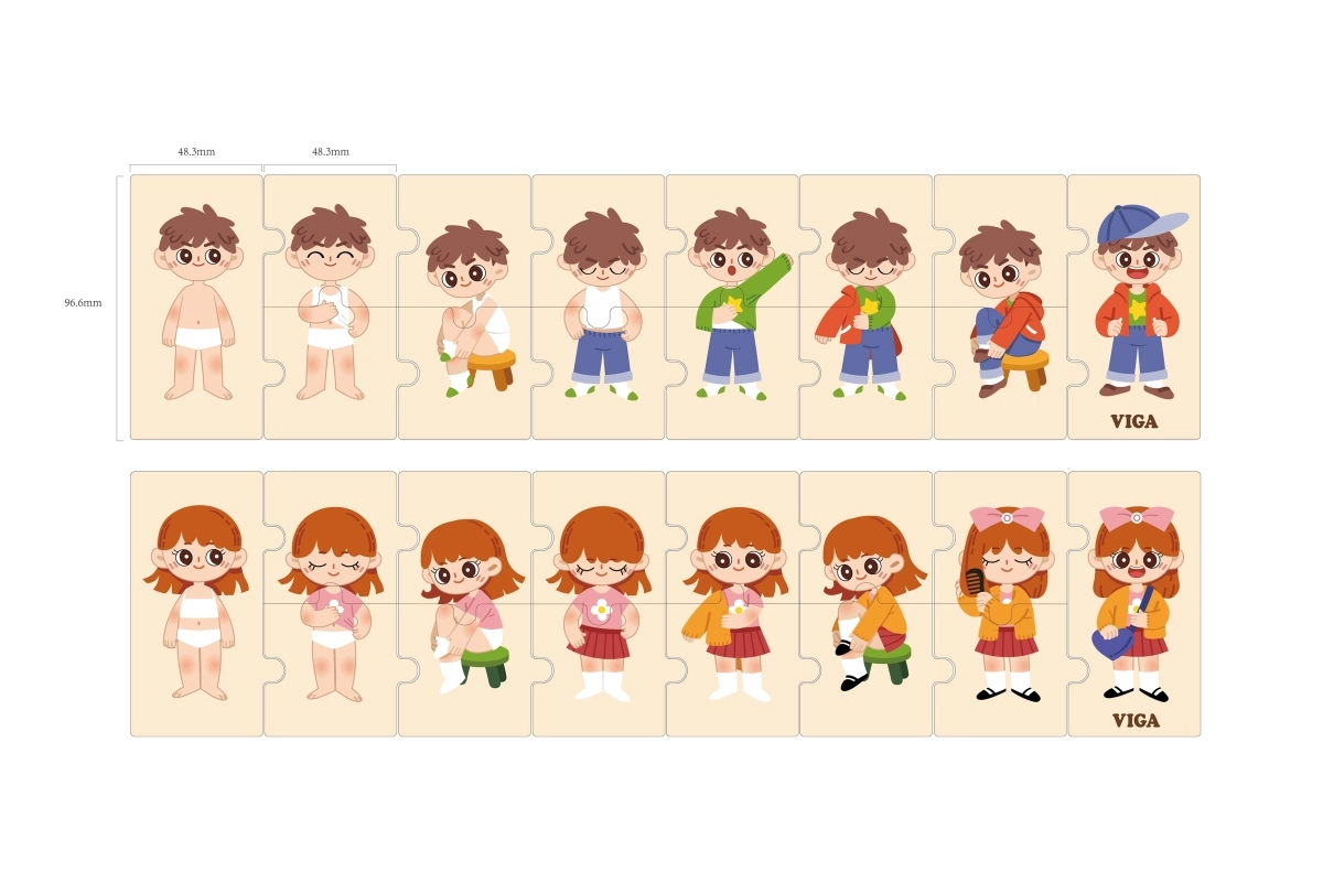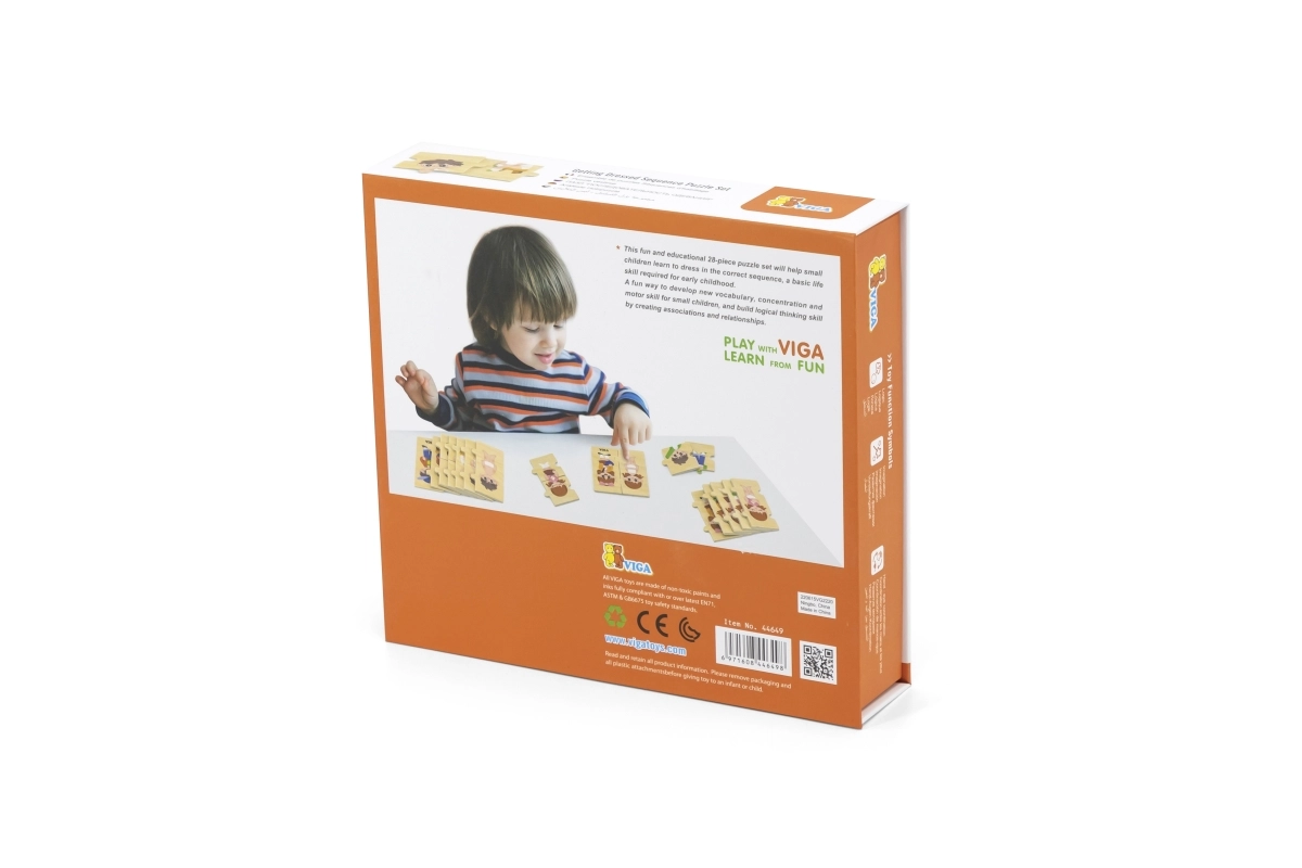 Este juguete educativo de madera de alta calidad enseña a los niños el proceso correcto de vestirse mediante el ensamblaje de piezas consecutivas con imágenes de un niño y una niña. Cada pieza tiene un motivo único y encaja con precisión, de modo que los niños practican la comprensión de relaciones y la paciencia mientras juegan.