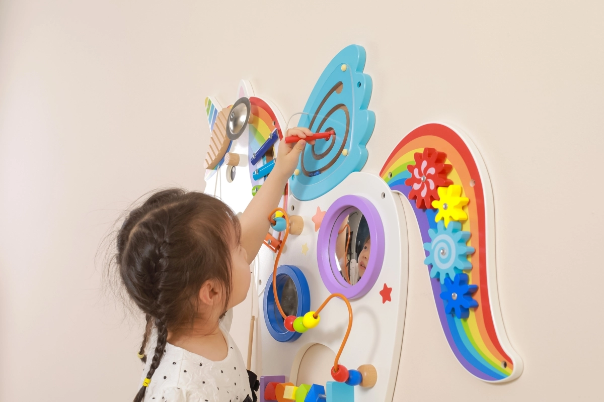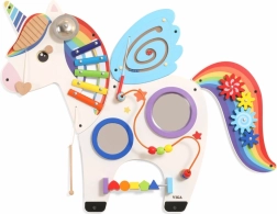 Este panel sensorial multifuncional de pared con forma de unicornio combina elementos musicales, táctiles y lógicos en un conjunto atractivo. Los niños pueden tocar el xilófono, hacer girar los engranajes, probar el laberinto magnético y los espejos, y practicar colores, formas y coordinación de movimientos.