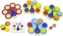 Incluye 4× tablero de madera de pavo, 36 discos en 6 colores, 20 cartas de tareas de doble cara y 2 dados de colores. El juego favorece tanto la actividad individual como en equipo y es una excelente preparación para la educación preescolar.