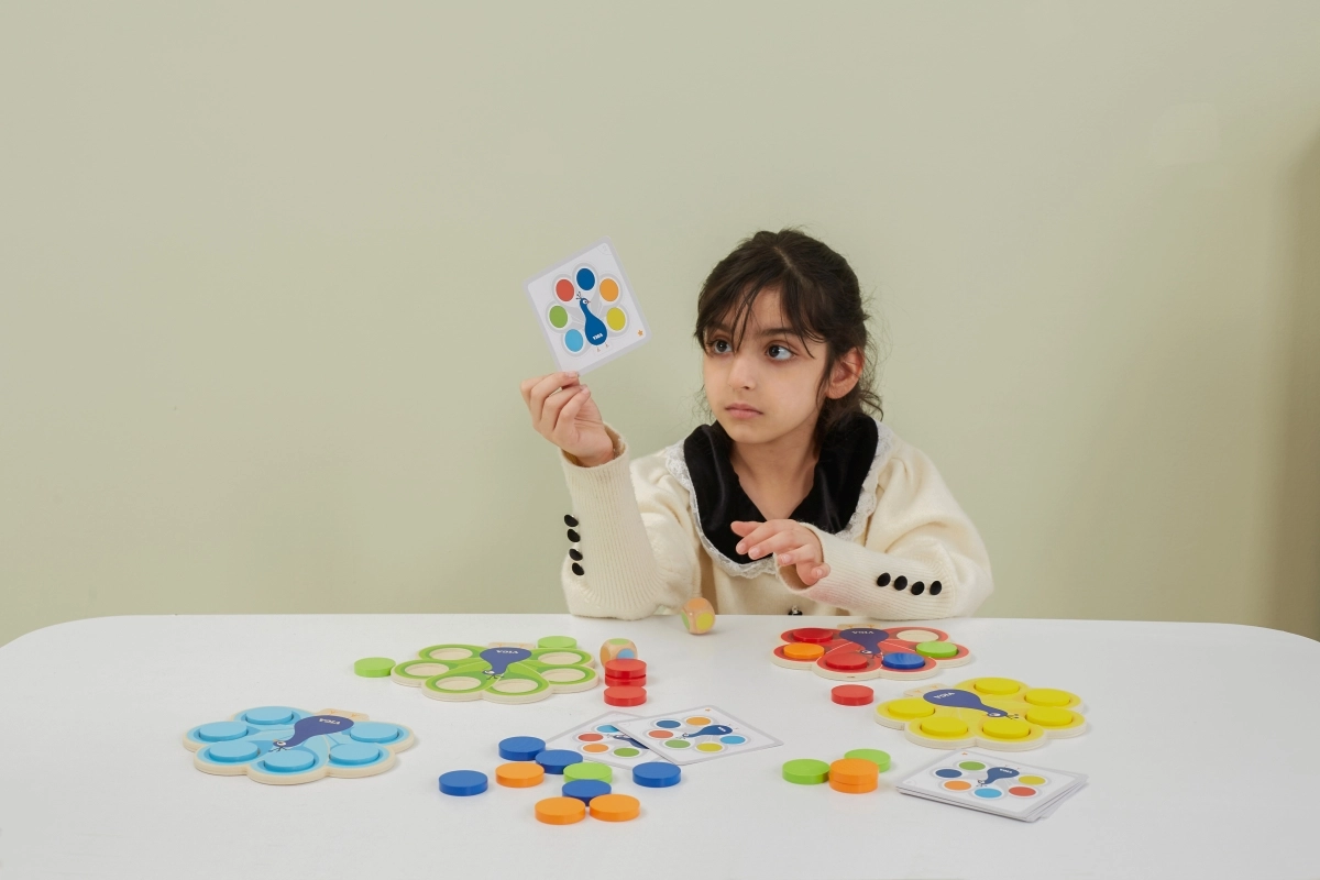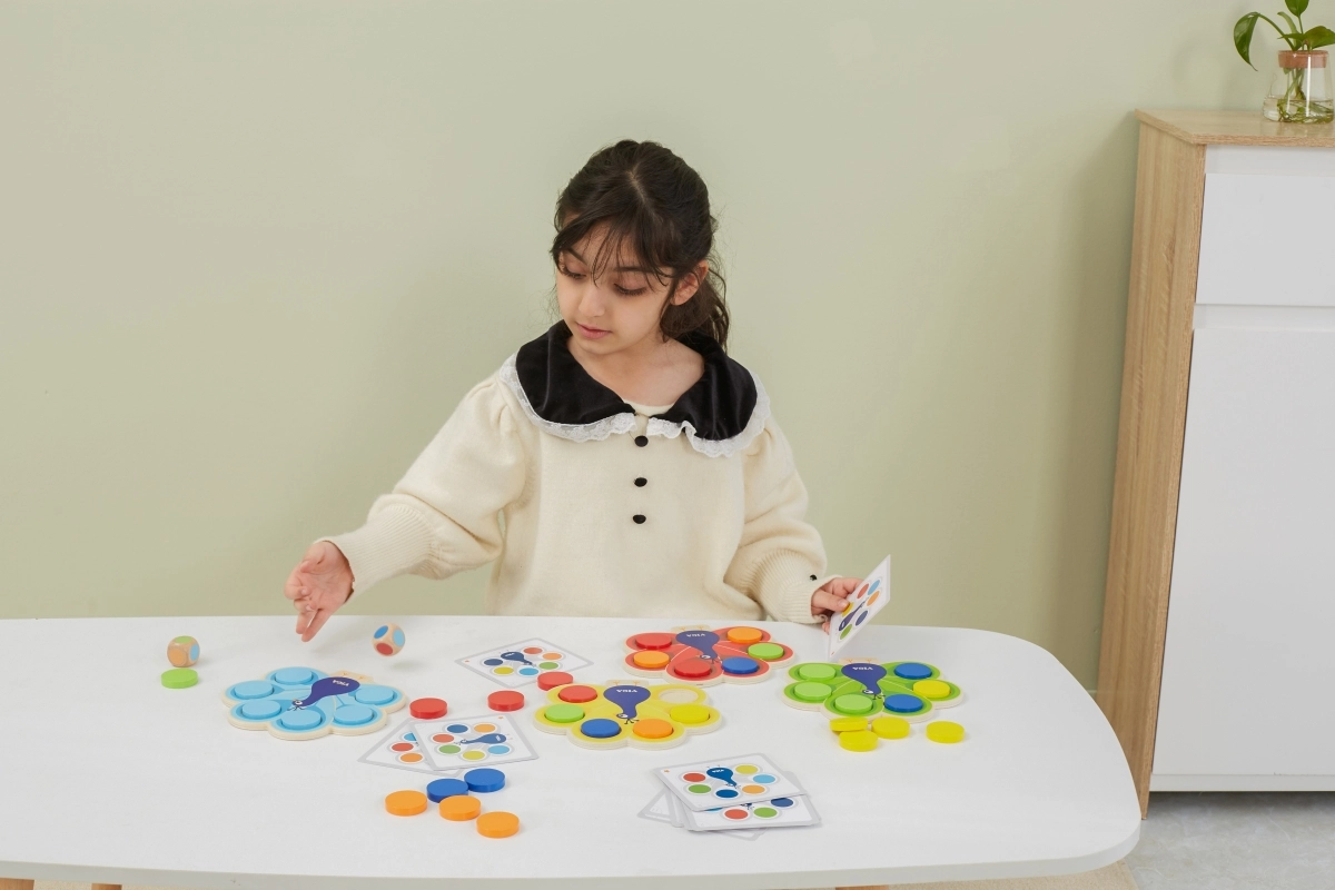Los niños asignan los discos según las cartas o la tirada del dado, asimilando los colores de manera natural mientras entrenan la atención y la lógica.