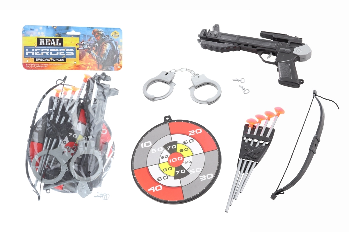 Divertido juego con ballesta para niños a partir de 3 años que incluye todo lo necesario para juegos emocionantes: desde la ballesta y el blanco hasta esposas de plástico y una pistolita.