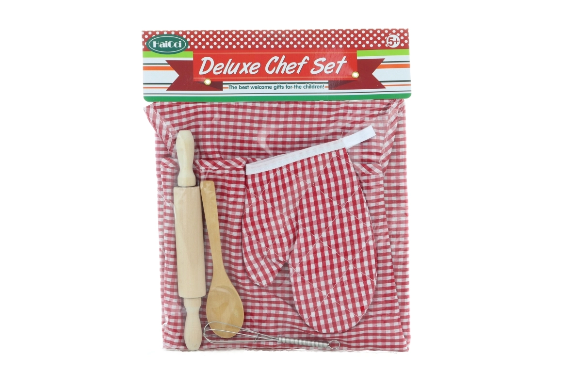 Completo set de cocina infantil para pequeños chefs a partir de 5 años que incluye todo lo necesario para los primeros pasos en cocinar y hornear. Contiene delantal, manopla, rodillo de madera (aprox. 20,5 cm), cuchara de madera (aprox. 14,5 cm) y batidor de metal (aprox. 12,5 cm). Ideal para desarrollar la motricidad fina, la creatividad y el juego seguro en la cocina.