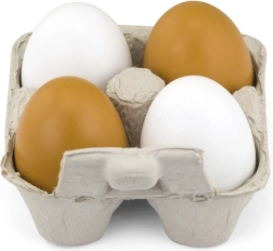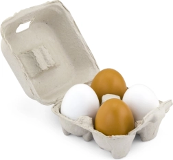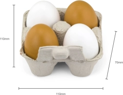 Encantador set de huevos de madera para la cocinita infantil que incluye 2 huevos blancos y 2 marrones en un cartón portahuevos realista. Los huevos, de aproximadamente 6 × 5 cm, fomentan el juego de roles, la motricidad fina y el aprendizaje de colores. Ideal para niños a partir de 24 meses.