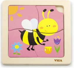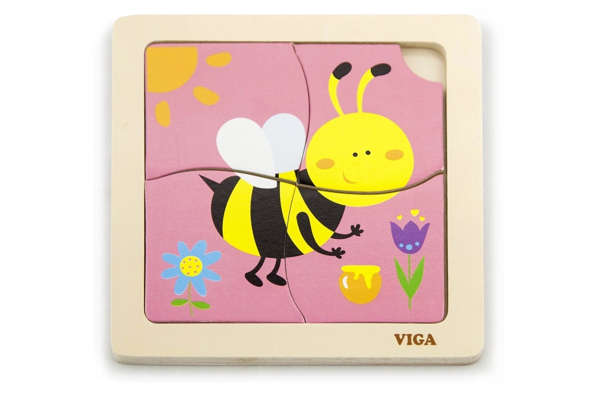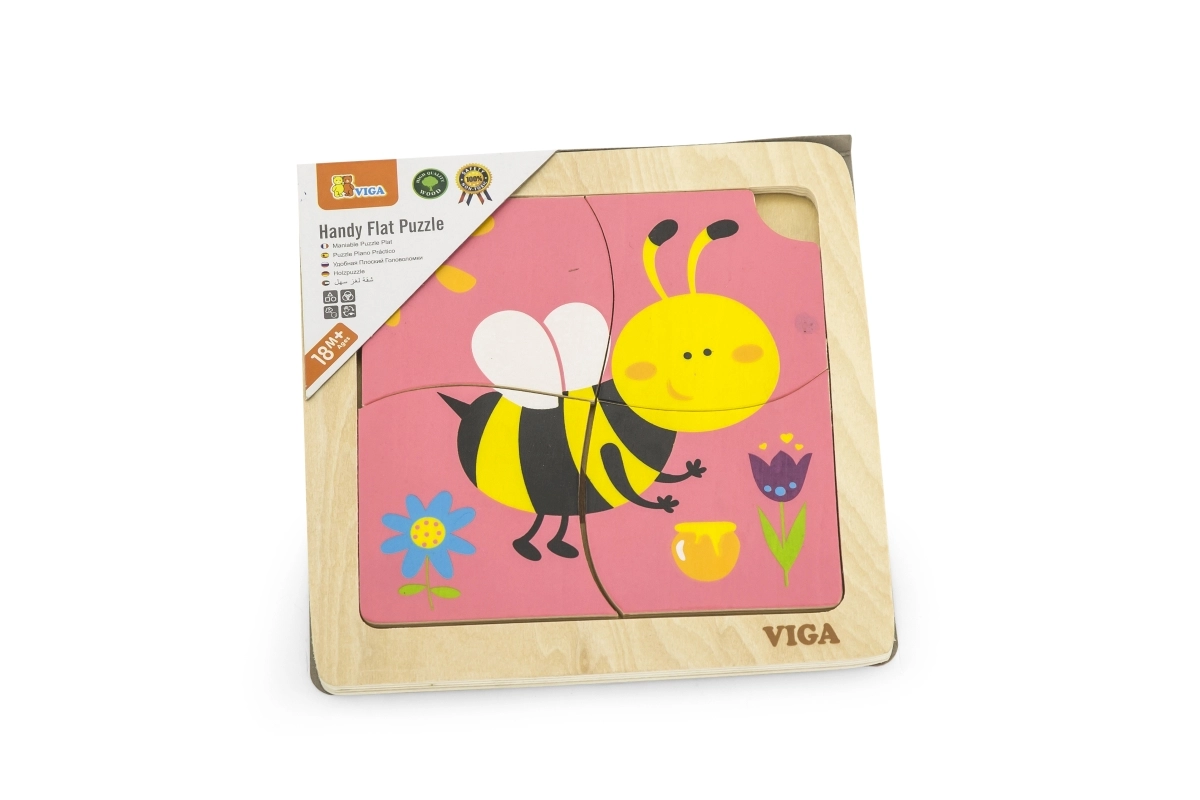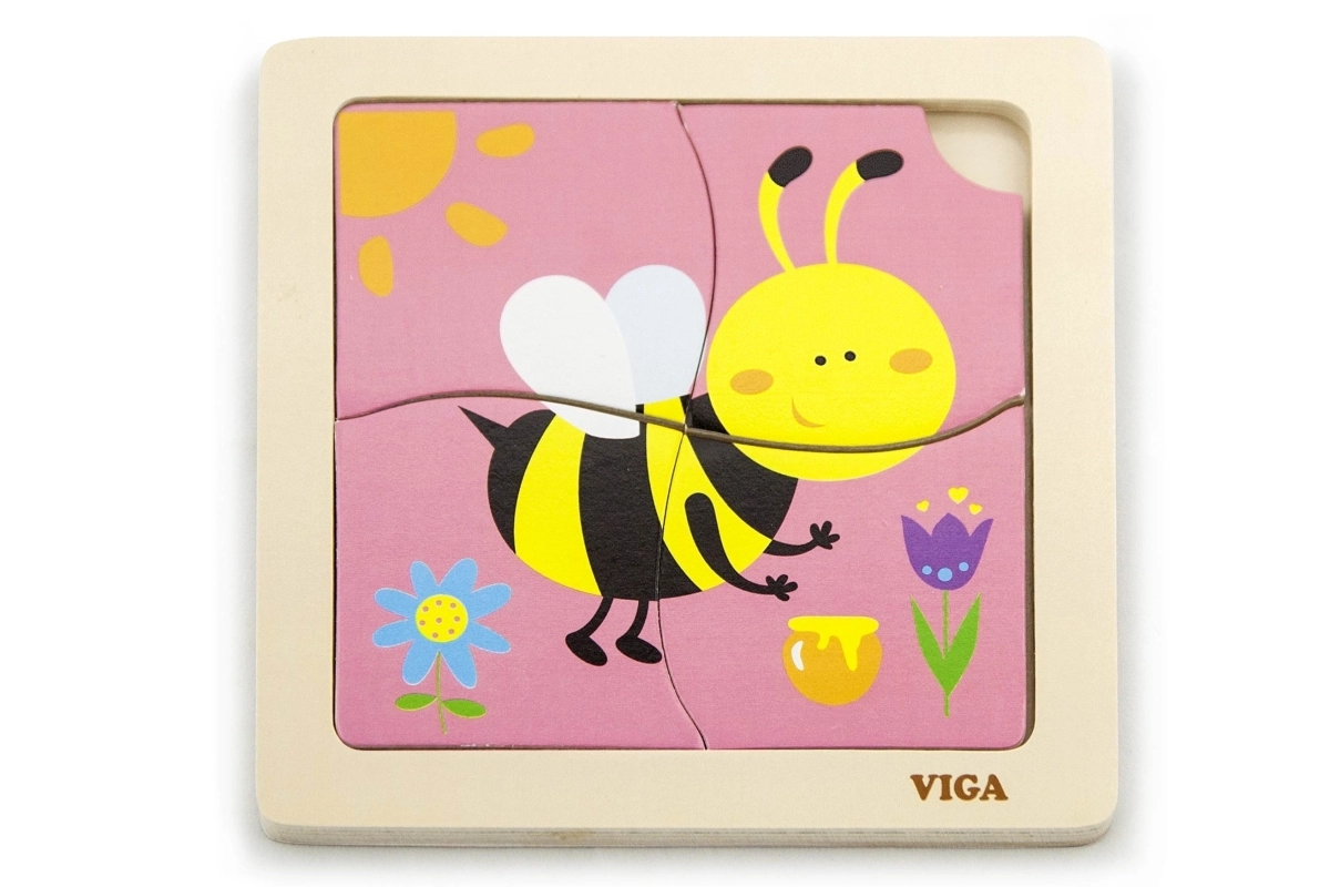 El rompecabezas incluye 4 piezas con motivo de abeja que se encajan formando la imagen en la base.