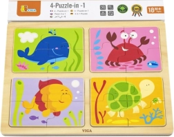 Descubre la alegría de armar estos rompecabezas de madera 4 en 1 con motivos de animales marinos. Cuatro puzzles independientes (ballena, cangrejo, pez y tortuga) fomentan la motricidad fina, el pensamiento lógico y el reconocimiento de formas y colores. Ideal para niños a partir de 18 meses.