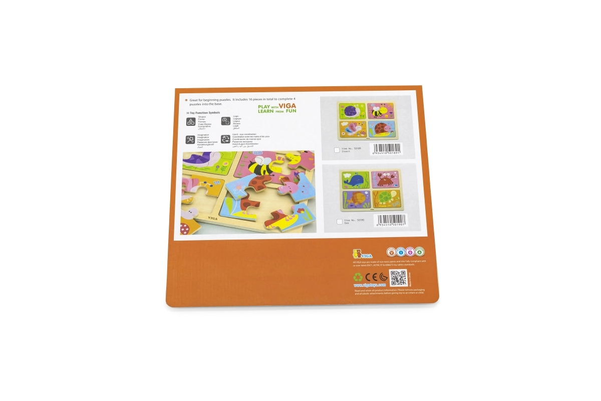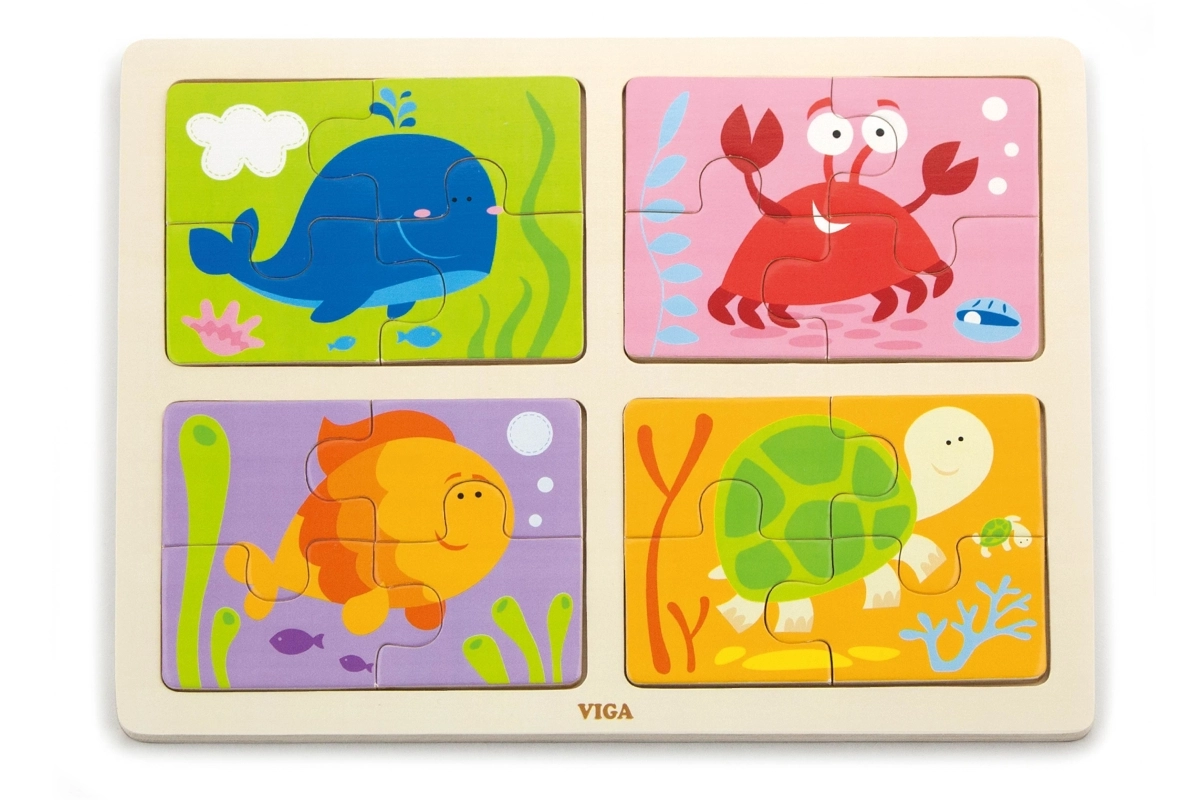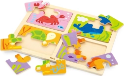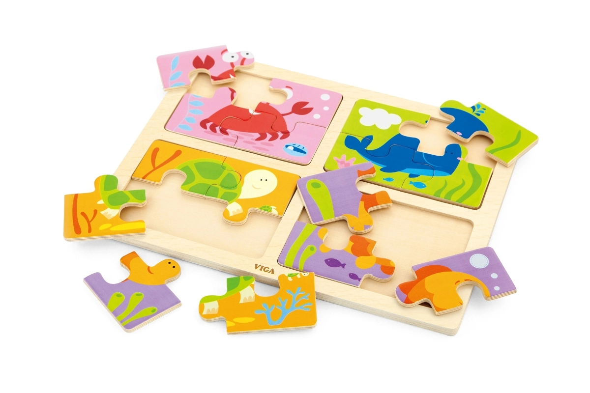 Este set incluye cuatro sencillos rompecabezas de madera con adorables motivos de animales marinos. Gracias a su número compacto de piezas, son ideales para la primera toma de contacto de los niños con los puzzles, desarrollan la coordinación mano-ojo y enseñan paciencia.