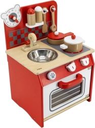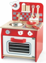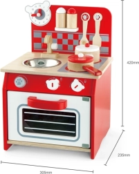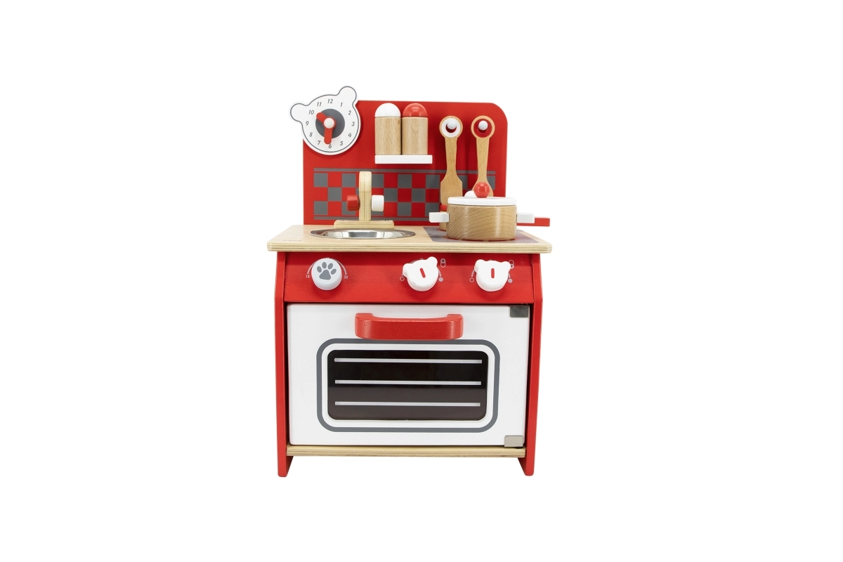 Gracias a su acabado de madera de alta calidad, esta cocinita no solo es duradera, sino también estéticamente atractiva. El paquete incluye además accesorios de juego, como una cuchara de cocina, un cucharón, una olla con tapa, una sartén con tapa y dos especieros.