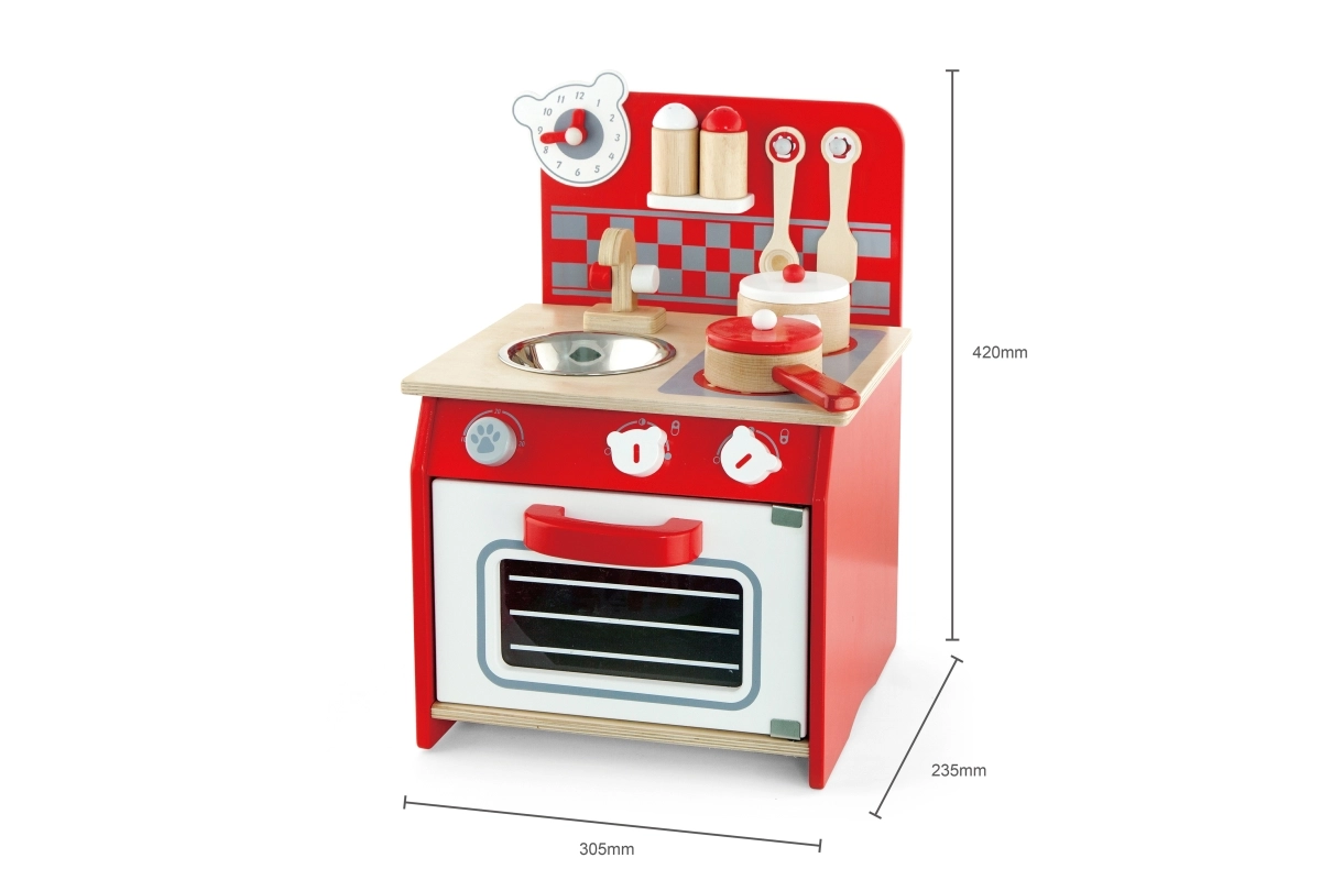 La cocinita de diseño ofrece fogones y horno realistas para un juego de cocina perfecto.
