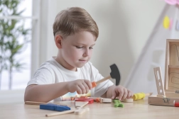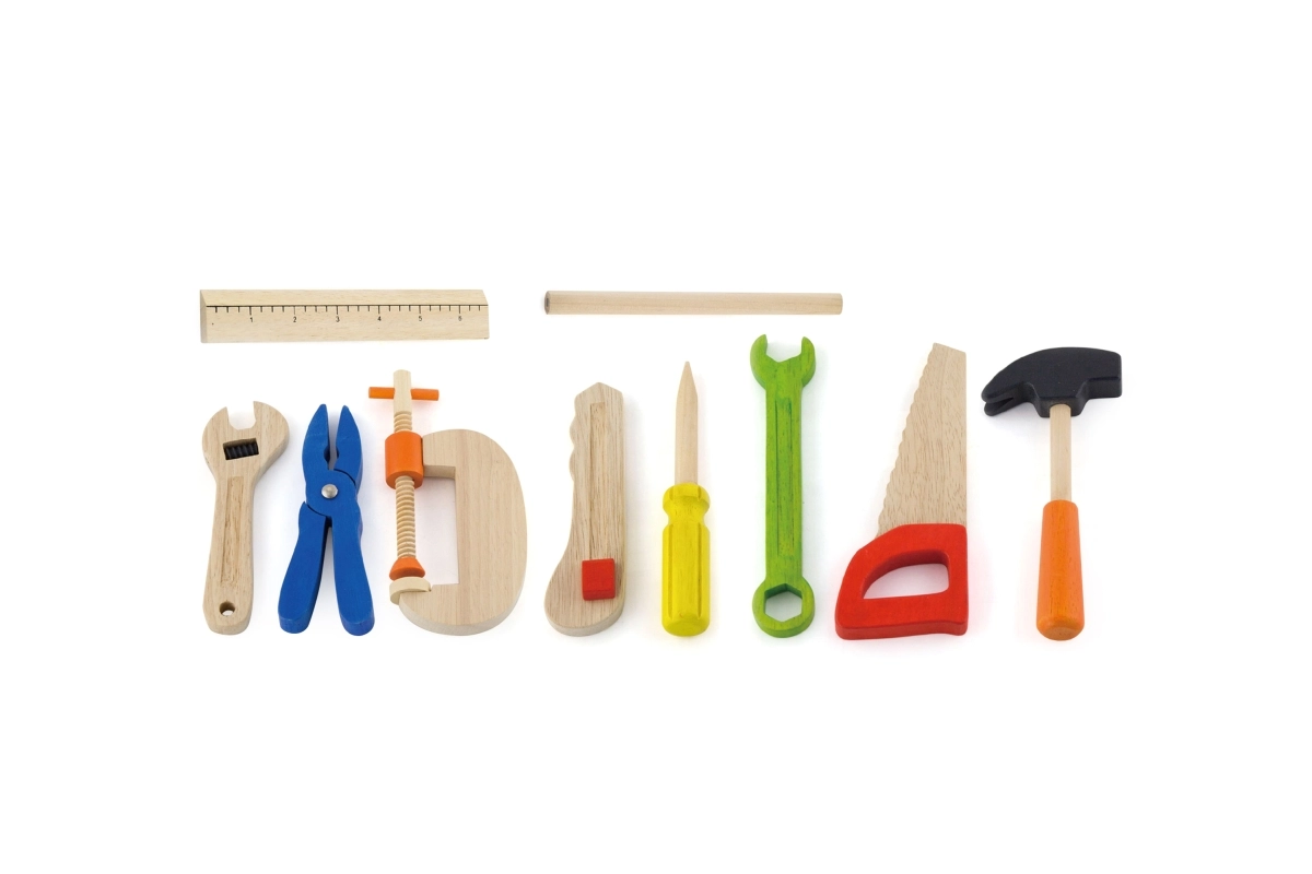 Un martillo, una sierra, una llave, un destornillador y otras herramientas de colores motivan el juego creativo y desarrollan la motricidad fina y la coordinación.