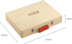El resistente maletín de madera con cierres metálicos y asa roja mantiene todo en su sitio, por lo que ninguna pieza se pierde. Gracias a su organización clara, cada herramienta tiene su lugar y todo el set se puede transportar fácilmente a visitas, viajes o al cuarto infantil.