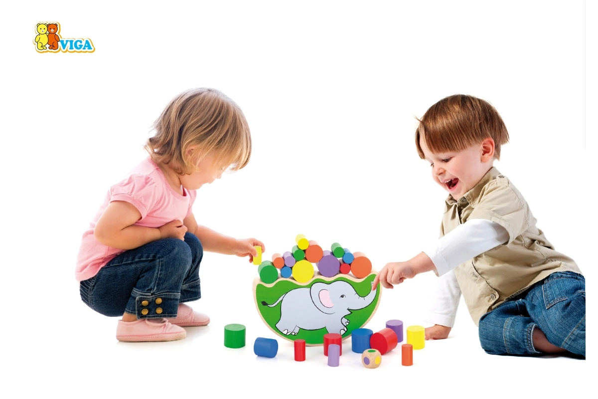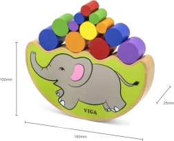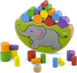 - Base de equilibrio con forma de elefante, cilindros de madera de colores, dado de colores