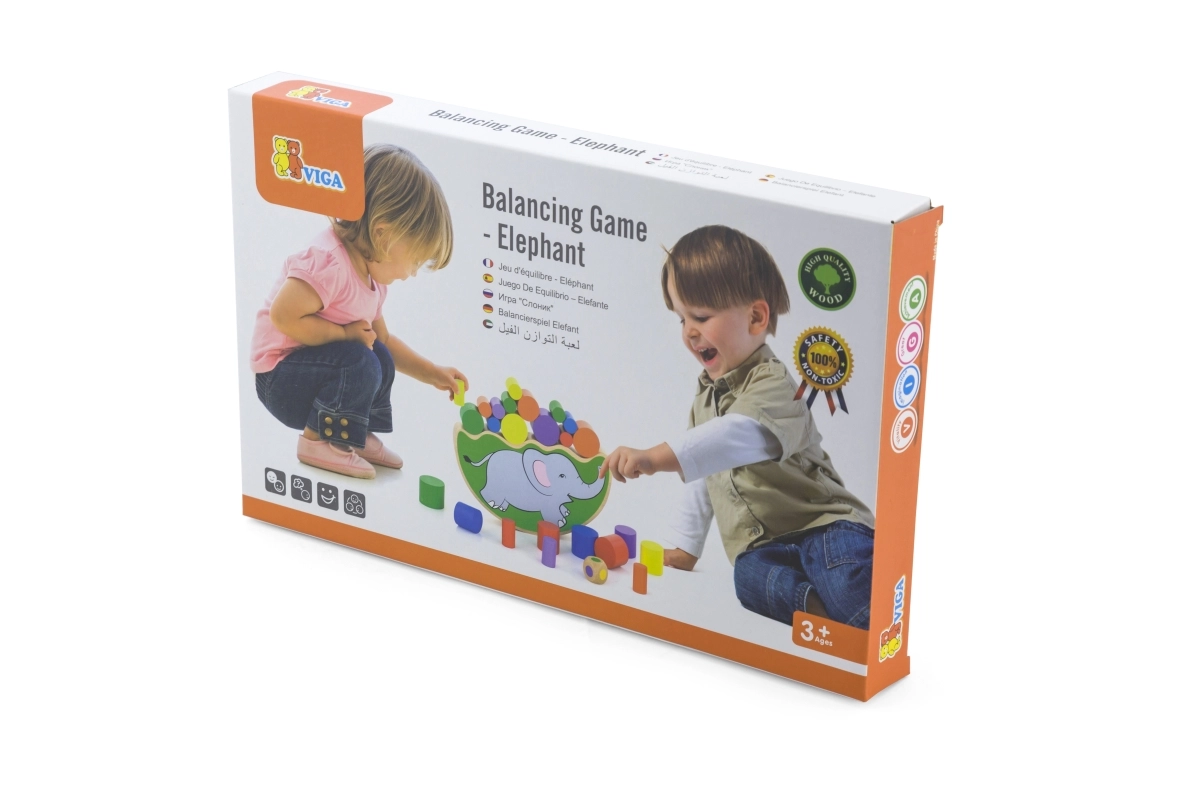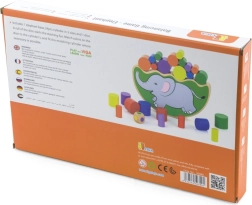 Divertido juego de madera para niños a partir de 3 años que desarrolla la motricidad fina, la paciencia y la coordinación ojo–mano. Los jugadores lanzan un dado de colores y, según el color obtenido, quitan o colocan un cilindro en la base del elefante ¡sin volcarlo!