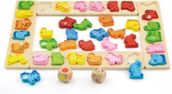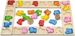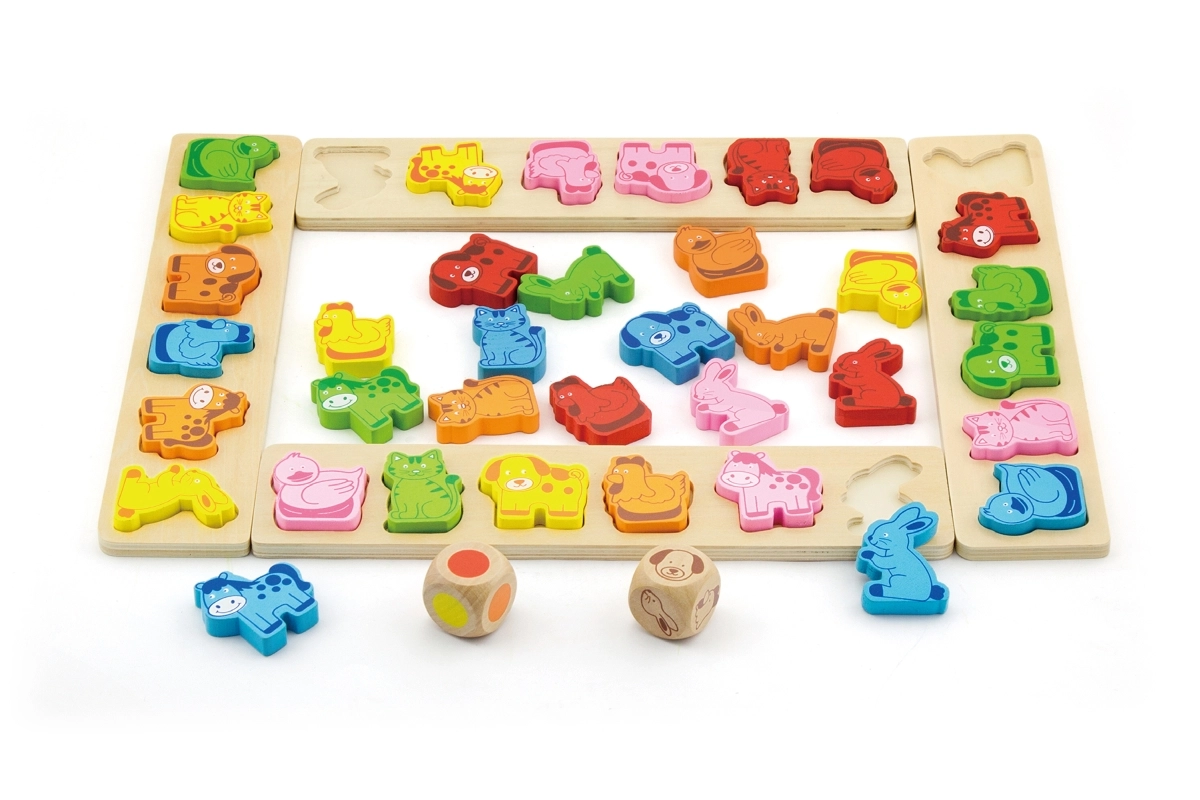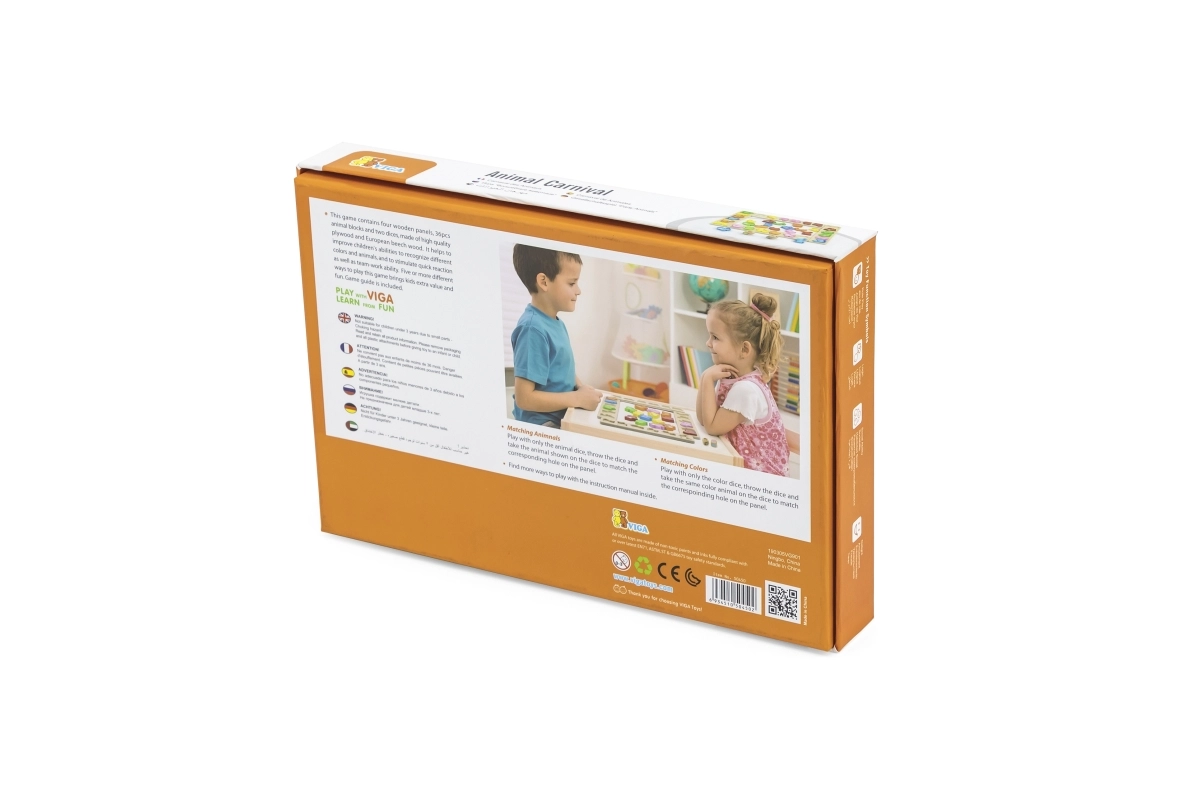Divertido juego de madera para niños a partir de 3 años que desarrolla el reconocimiento de colores y animales, entrena el pensamiento rápido y los reflejos y fomenta habilidades lingüísticas, de conteo y de trabajo en equipo. El set de contrachapado de calidad y madera de haya incluye 4 tableros, 36 piezas de animales y dos dados: uno de colores y otro con animales.