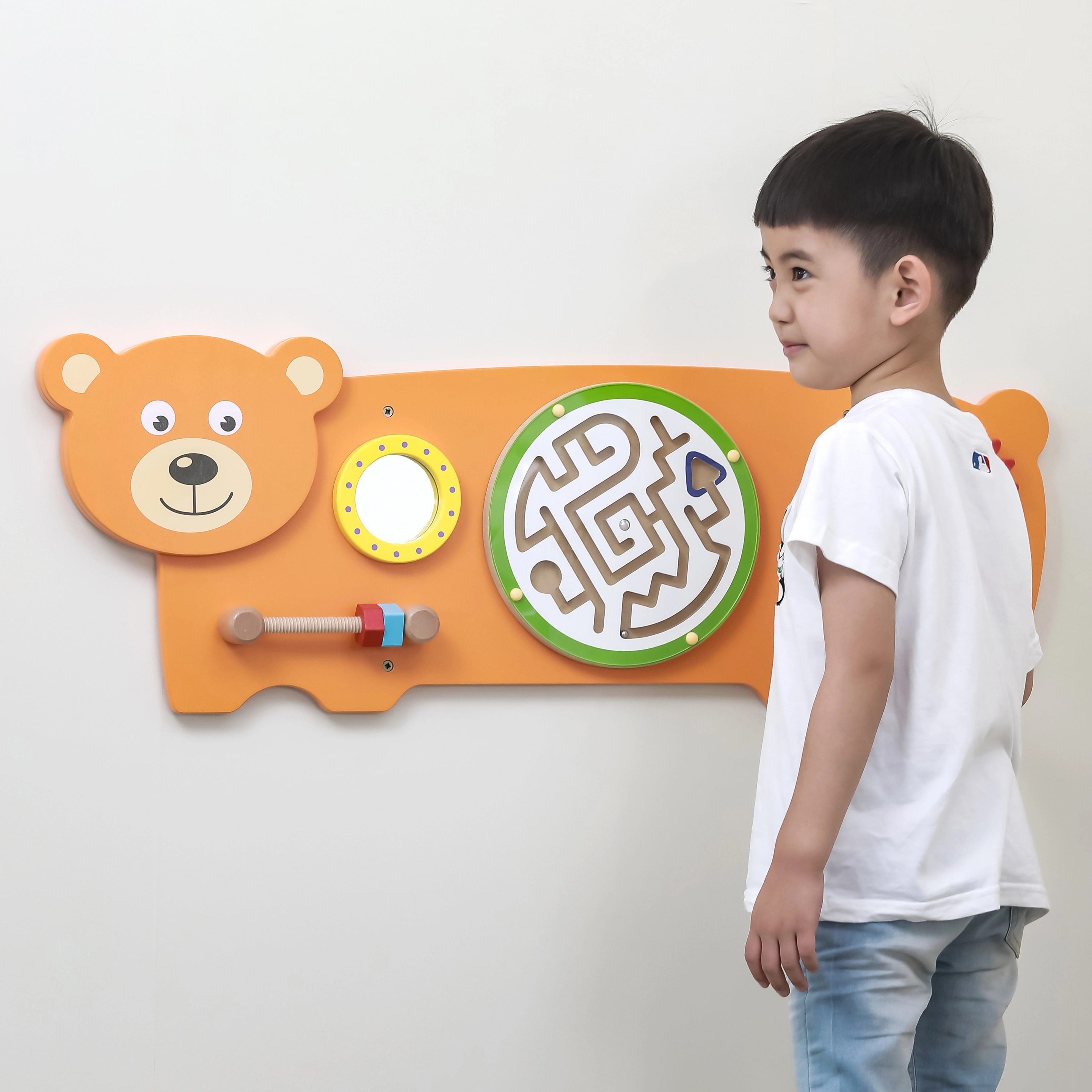 El tablero sensorial Osito está diseñado según los principios Montessori para motivar de forma natural a los niños a explorar y practicar habilidades. Ofrece varios tipos de actividades: girar engranajes, guiar la bolita en el laberinto, observarse en el espejo seguro y entrenar el agarre con tornillos roscados. Gracias a su robusta construcción de madera y a la posibilidad de montaje en pared, es ideal para habitaciones infantiles, salas de juego y jardines de infancia.